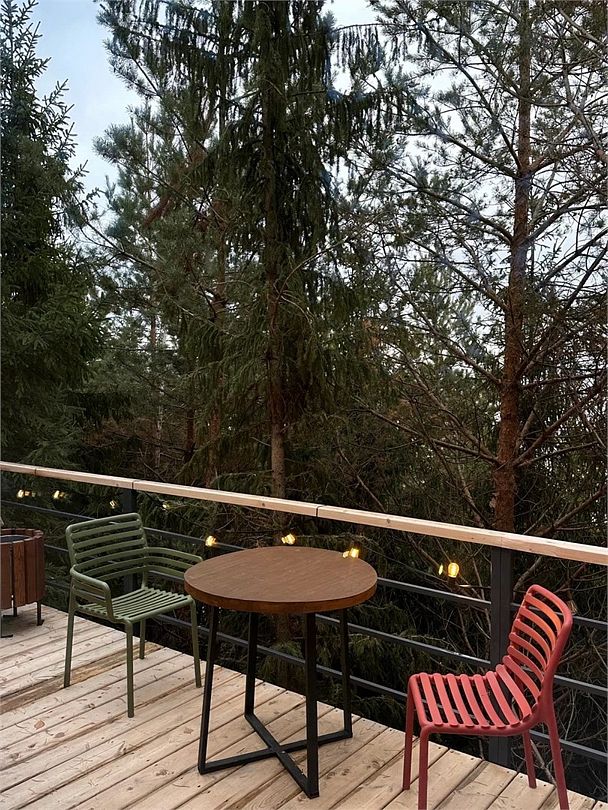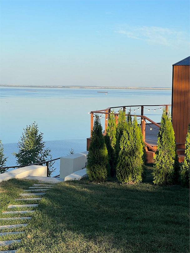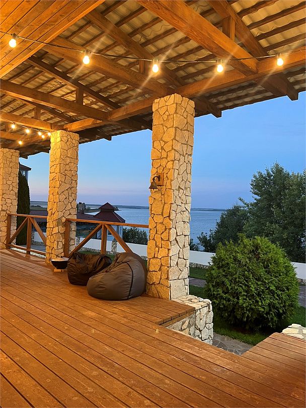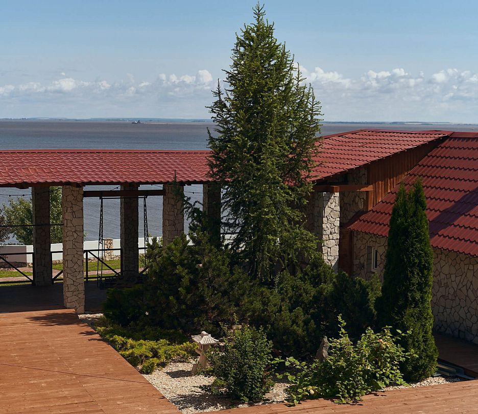 Терраса дома с видом на камское море. На ее территории есть мангальная зона и японский чан «Фурако». Эко-отель — идеальный формат отдыха, подходящий для тех, кто устал от шума города. Здесь вы сможете остаться наедине с собой, отдохнув телом и душой.