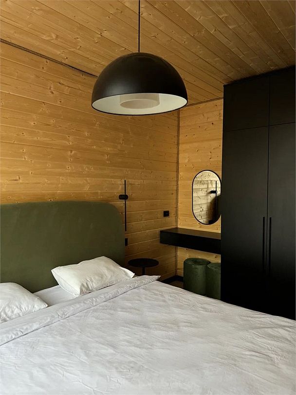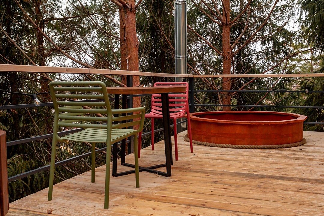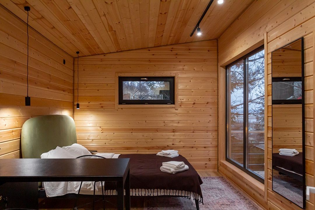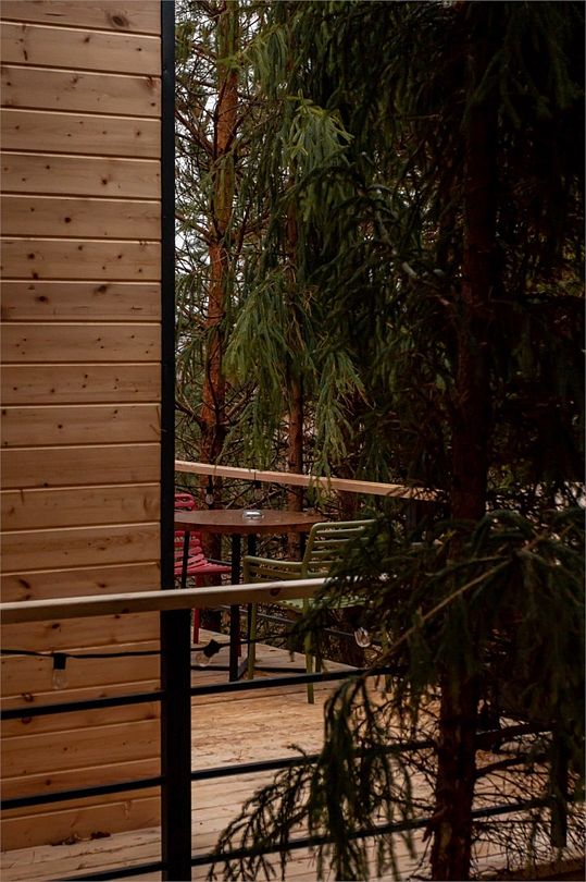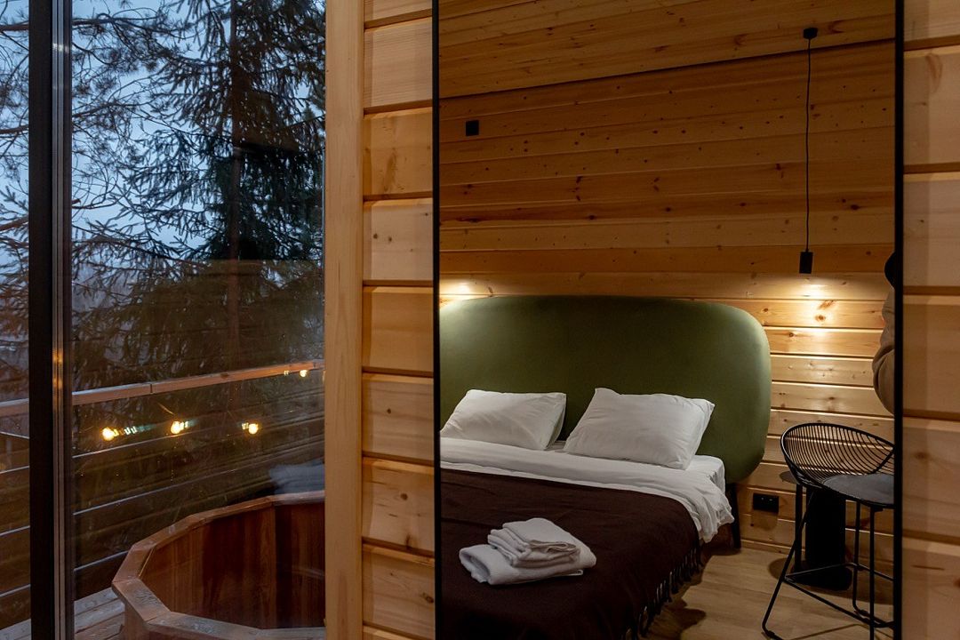Домик в лесу — идеальный домик для двоих посреди елового леса! Домики оснащены всем необходимым для комфортного пребывания: двуспальная кровать, гостиная с проектором, кухня, оборудованная холодильником, СВЧ-печью и посудой, а также терраса с BBQ-зоной и чаном Фурако.