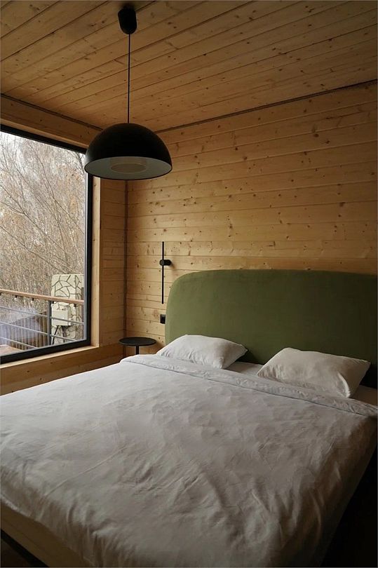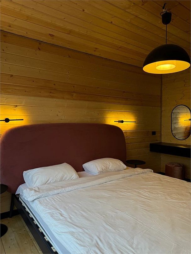 Внутри домика вы найдете: двуспальную кровать, гостиную с проектором, кухню, оборудованную холодильником, СВЧ-печью и посудой. Здесь есть все, чтобы вы с полным комфортом могли ощутить настоящее единение с природой.