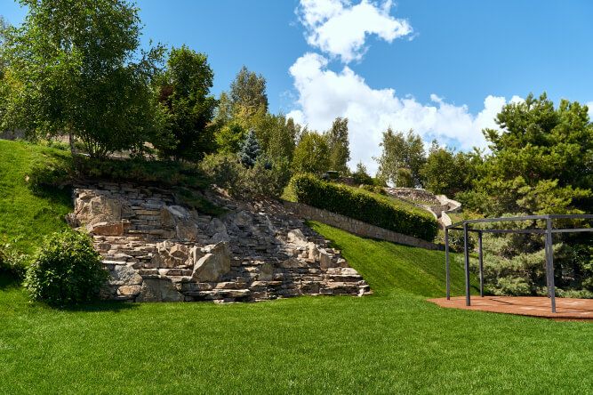 Архитектура «Масловки» органично вписывается в окружающий ландшафт. Каскадные лестницы и эко-материалы, среди которых стоит отметить дикий камень, привезенный с Кавказа, и живую изгородь из деревьев, создают атмосферу уединения и гармонии с природой. Висячие каменные тропы соединяют все уголки отеля, позволяя гостям почувствовать себя единым целым с окружающим миром. Интерьеры домиков оформлены в натуральных текстурах и тонах, что позволяет гостям ощутить близость к природе.