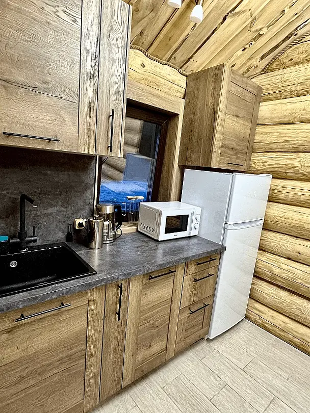 Зона отдыха включает комфортный диван, обеденный стол и камин, который дарит тепло и уют, а панорамные окна открывают живописные виды на окружающий лес. Кухня оснащена всем необходимым: посудомоечной машиной, холодильником, чайником и кухонными принадлежностями, что делает посещение бани более удобным и приятным.
