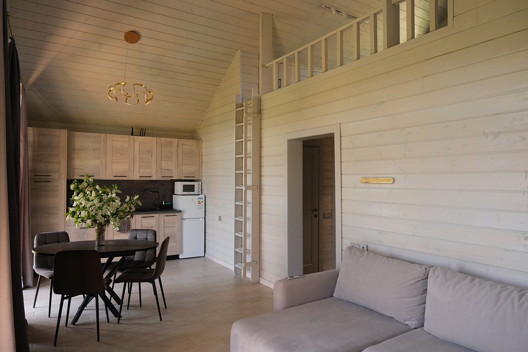 Каждый домик — это уединенное пространство, оборудованное всем необходимым для комфортного отдыха: уютной спальней и современной кухней с микроволновой печью и посудомоечной машиной. Для тех, кто хочет расслабиться после активного дня, есть финская сауна и душ с горячей водой.