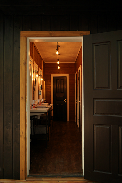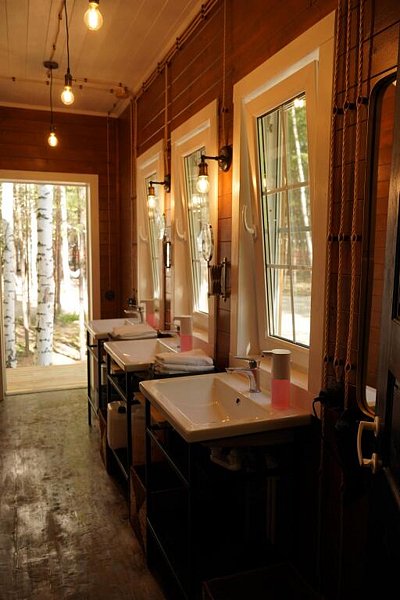 Отдельное здание с санузлами и душевыми, раковины для умывания.