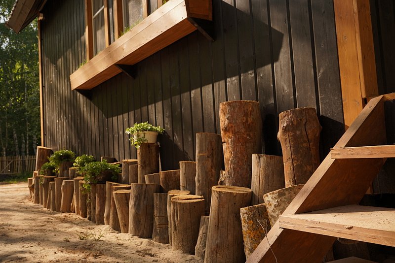 Небольшая СПА-зона в лесу с баней-бочкой и чаном.