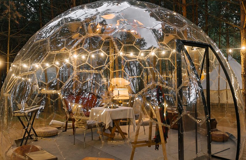 Романтический ужин при свечах в лесу. Ужин на двоих в винтажном интерьере купола в лесу.