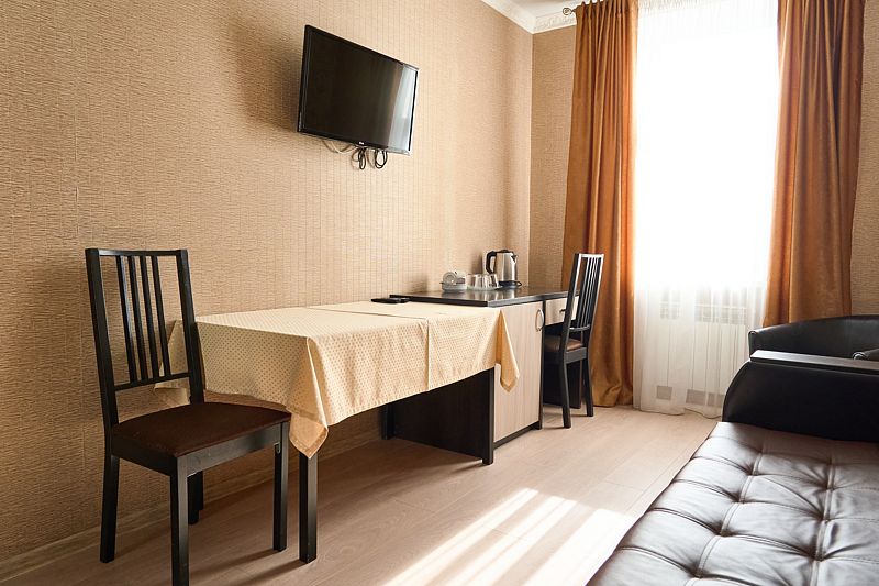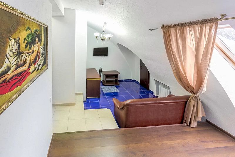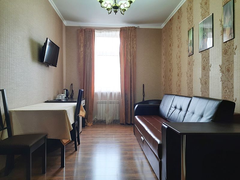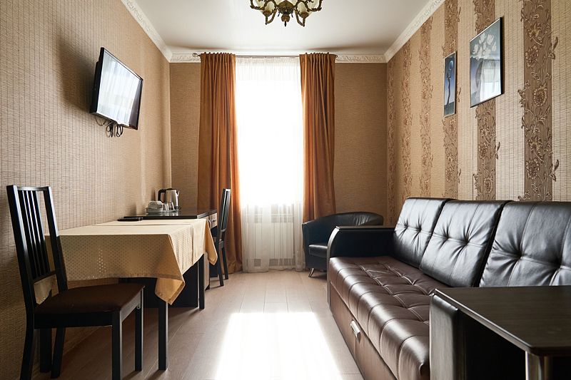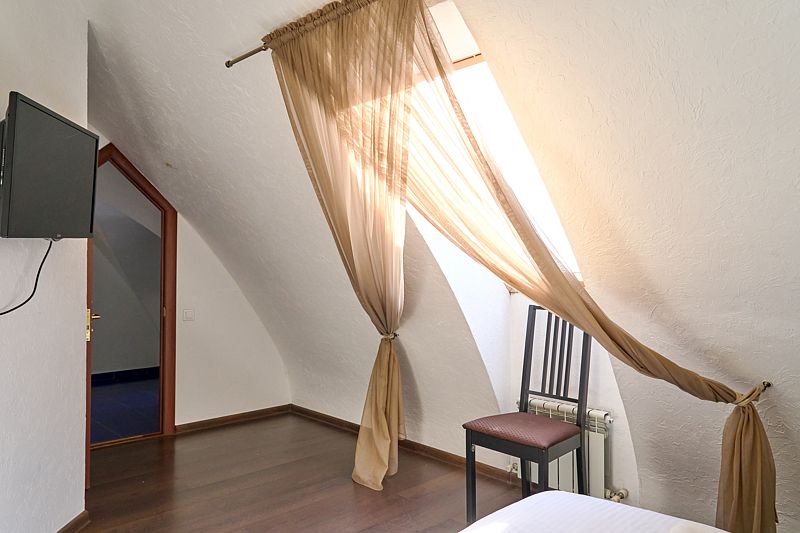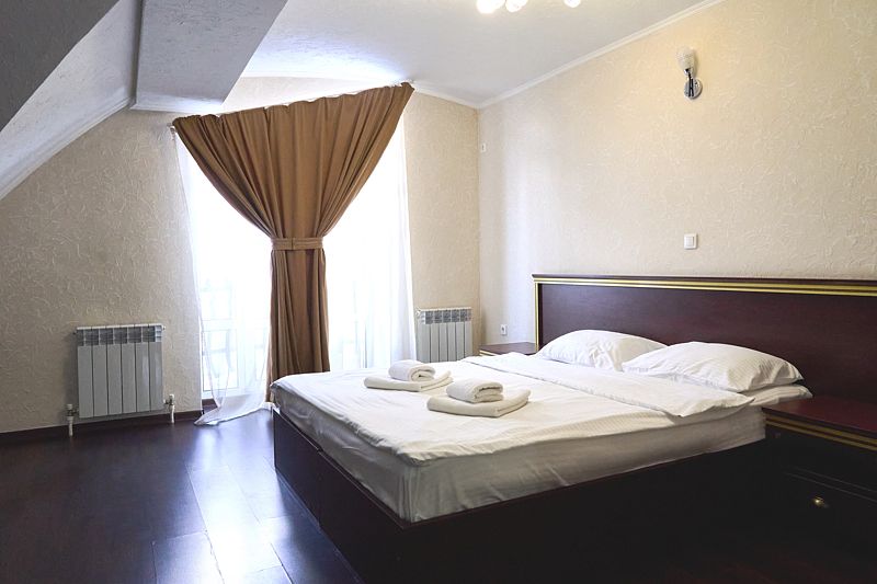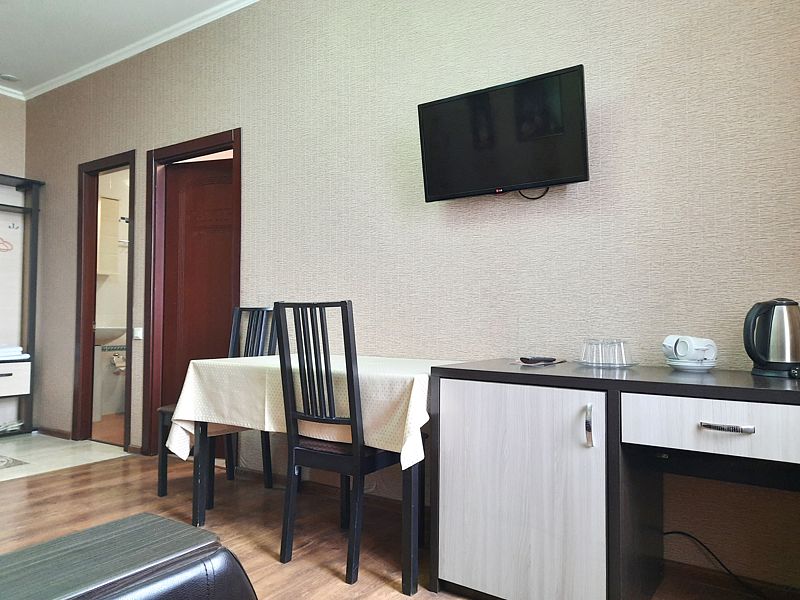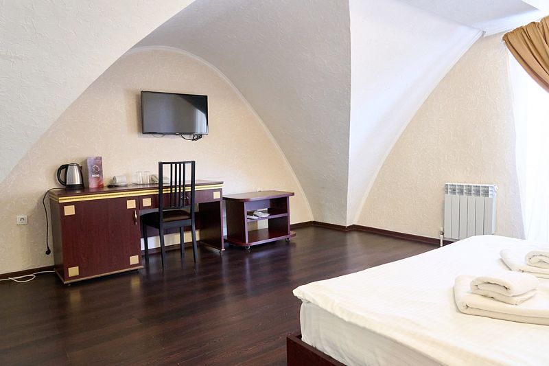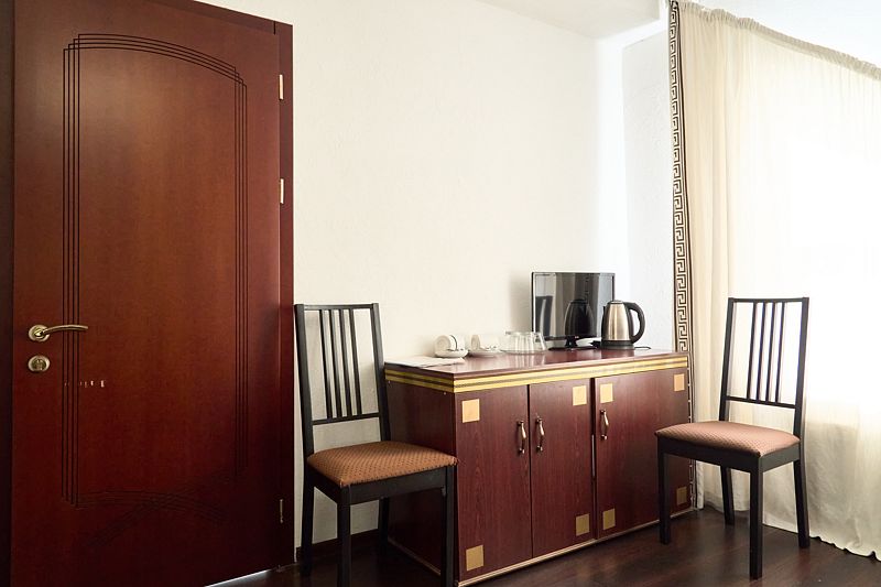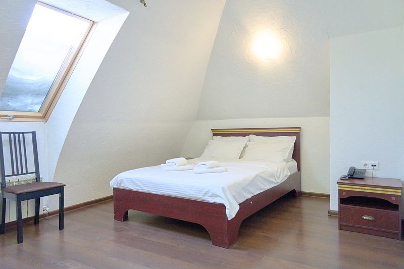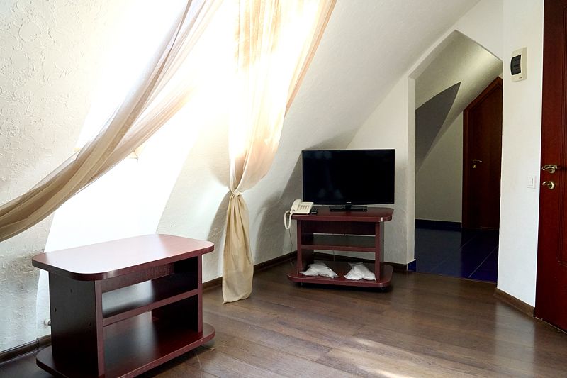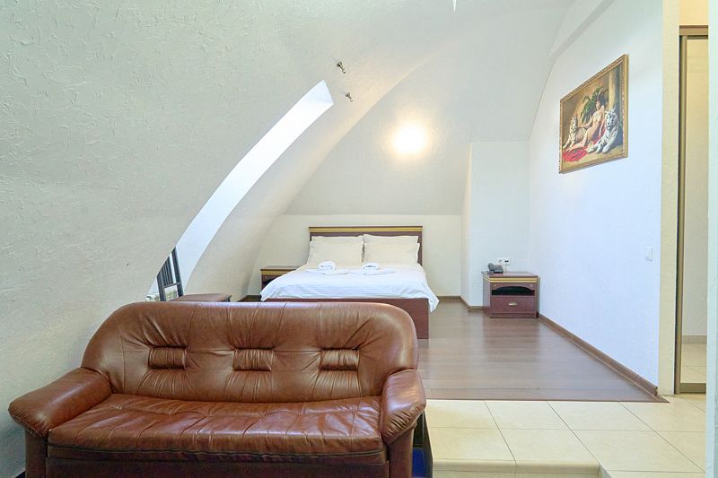 Номер класса «Полулюкс» двухместный с одной большой кроватью. Очень просторный номер, шкаф для хранения одежды, мини-холодильник, ТВ, кондиционер. В собственной ванной комнате установлена сауна. В стоимость включены завтраки на каждого гостя.