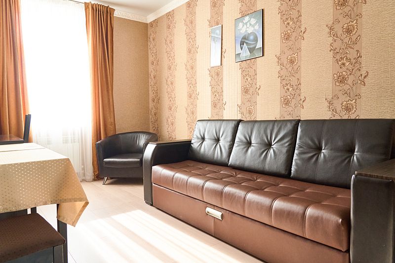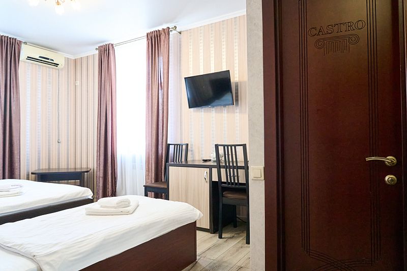 Номер стандарта «Люкс» в отеле CASTRO. 2 комнаты — спальня и гостиная. В спальне одна большая двуспальная кровать, в гостиной есть раскладывающийся диван. Номер полностью мебелирован, есть шкаф для хранения одежды, ТВ, кондиционер. В стоимость включен завтрак на 2 персоны.
