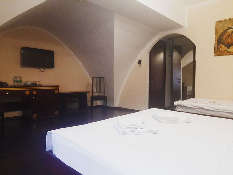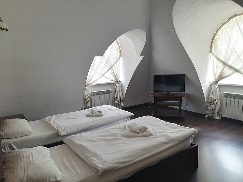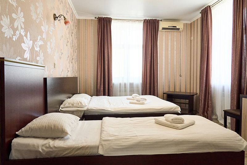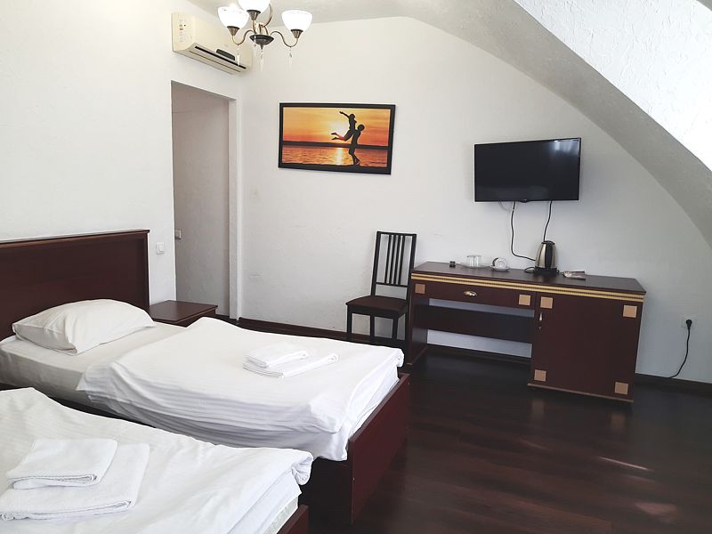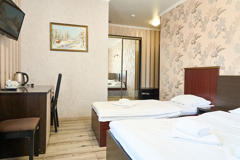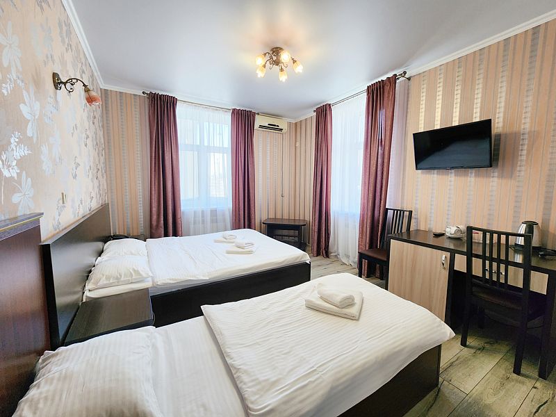 2-х местный классический однокомнатный номер с двумя односпальными кроватями. В номере шкаф для хранения одежды, мини-холодильник, ТВ, кондиционер. Собственная душевая комната/туалет. В стоимость включены завтраки на каждого гостя.