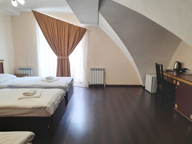 Стандартный номер для трех взрослых с тремя односпальными кроватями. Так же в номере шкаф для хранения одежды. мини-холодильник, ТВ, кондиционер. Собственная душевая комната/туалет. В стоимость включены завтраки для каждого гостя.