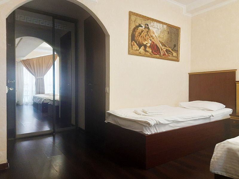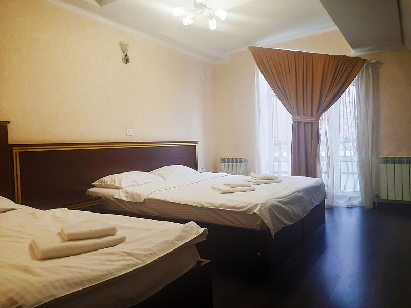 Стандартный семейный номер, комфортно для размещения семьи из 3-х человек. Большая двуспальная кровать + одна односпальная. В номере шкаф для хранения одежды, мини-холодильник, ТВ, кондиционер. Собственная душевая комната/туалет. В стоимость включены завтраки на каждого гостя.