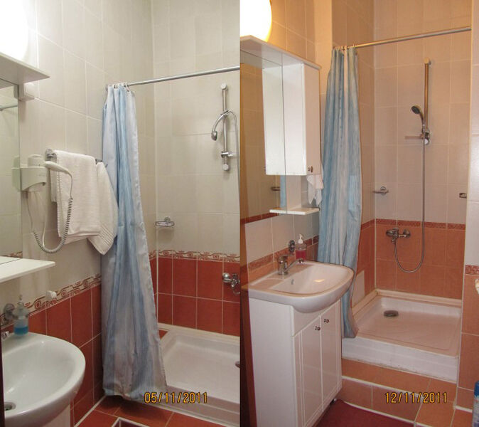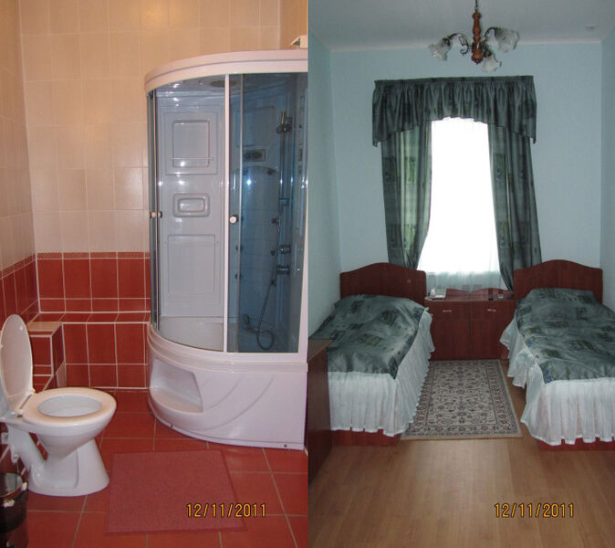 Комната с двумя раздельными кроватями или одной двуспальной кроватью, ванная комната с душевой кабиной