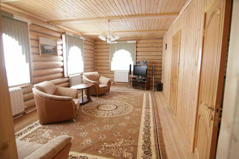 - большой зал с раскладным диваном, мягкой мебелью и пушистыми коврами;