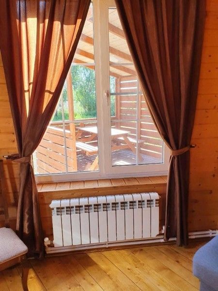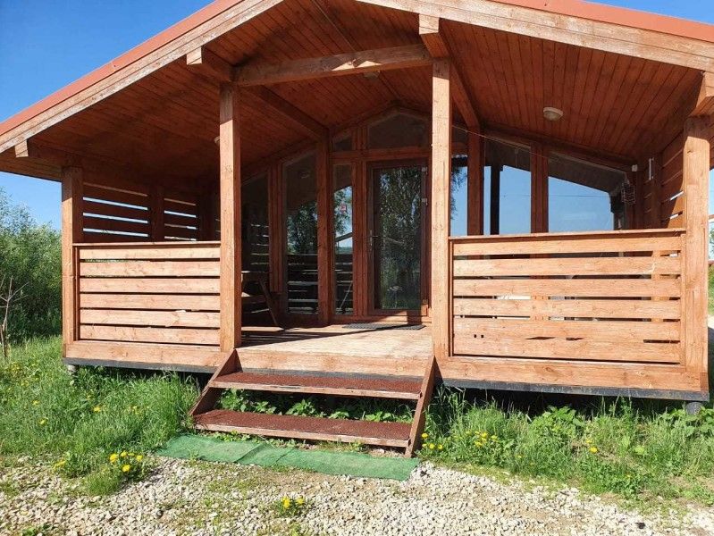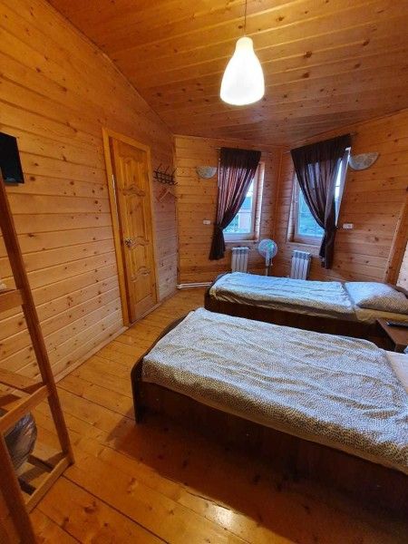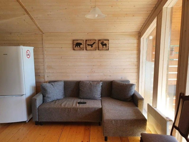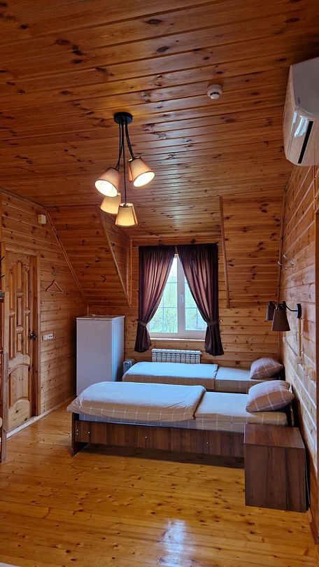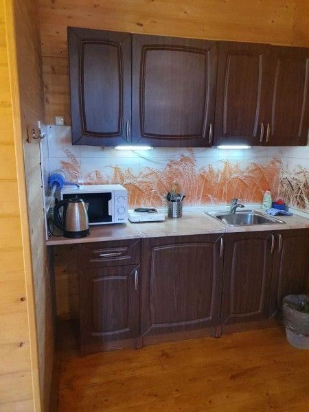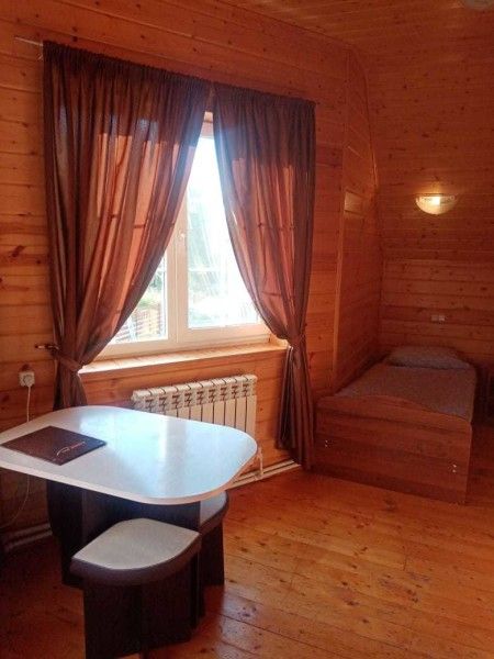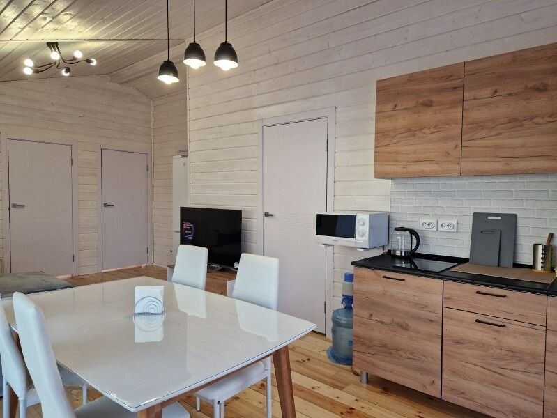 Оборудован всеми удобствами: санузел с душевой, кондиционер и обогреватели. Есть собственная кухня с микроволновкой, индукционной плиткой, электрическим чайником, посудой. Имеется собственный мангал.