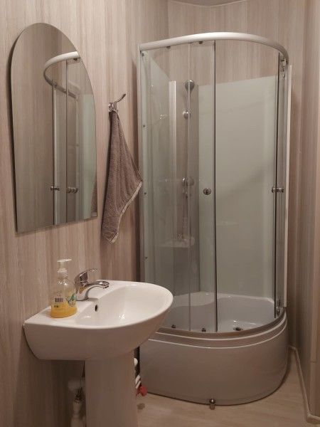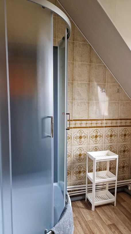 Собственный санузел (душевая, туалет, раковина) на этаже напротив номера.