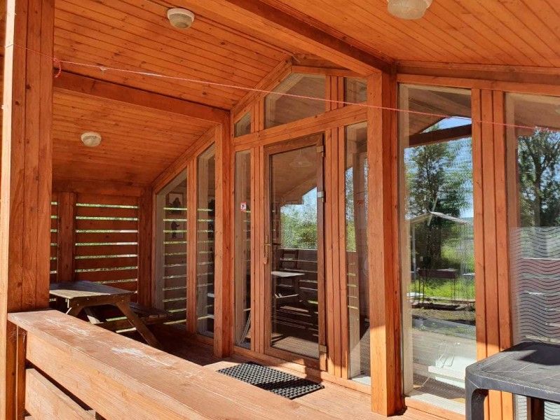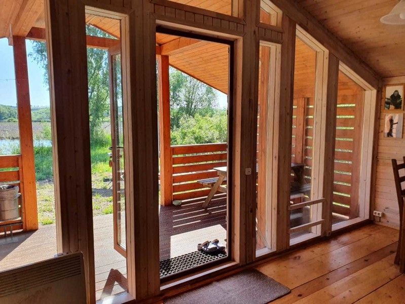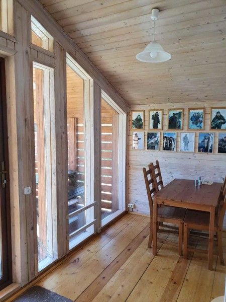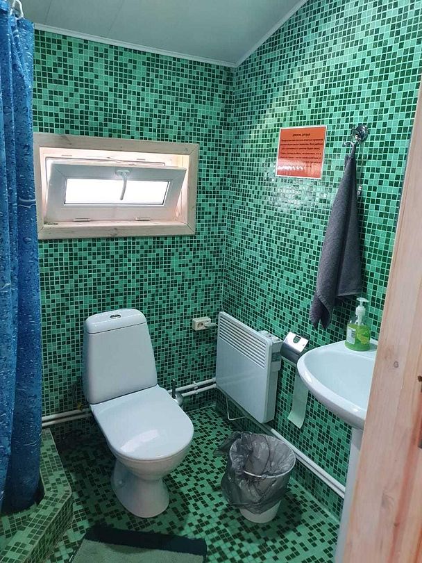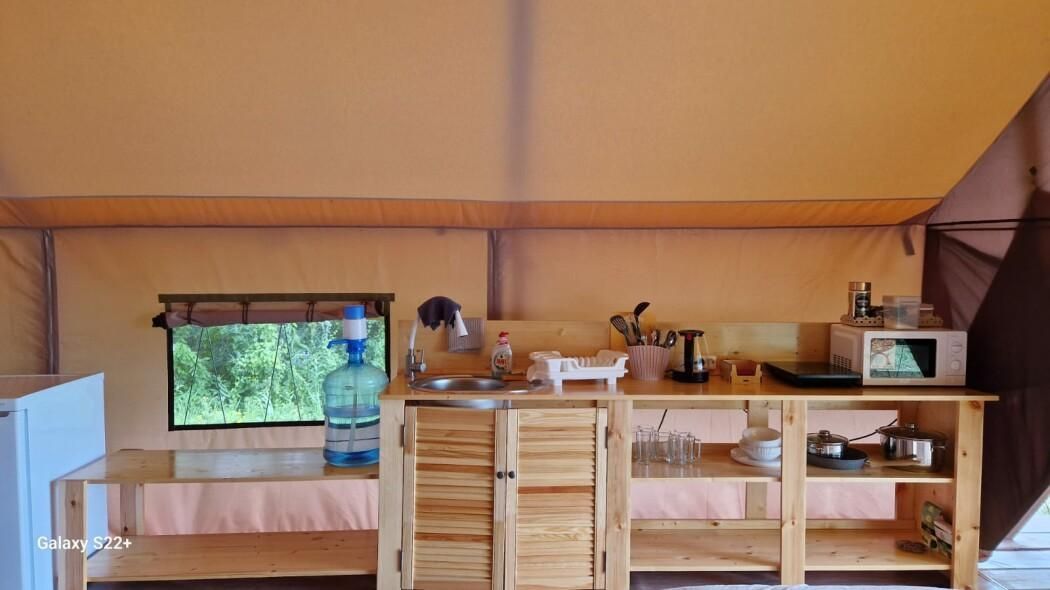 Оборудован всеми удобствами: санузел с душевой, кондиционер и обогреватели. Есть собственная кухня, оборудованная микроволновой печью, индукционной плиткой, электрическим чайником и посудой. Также имеется мангал.