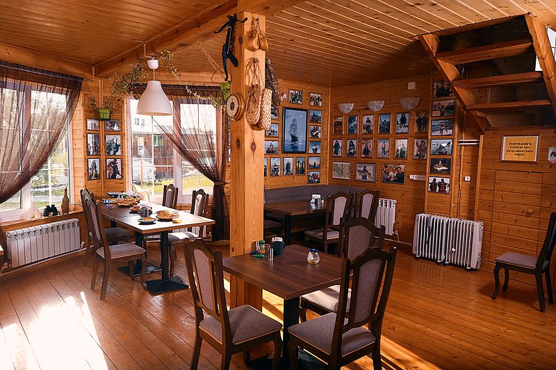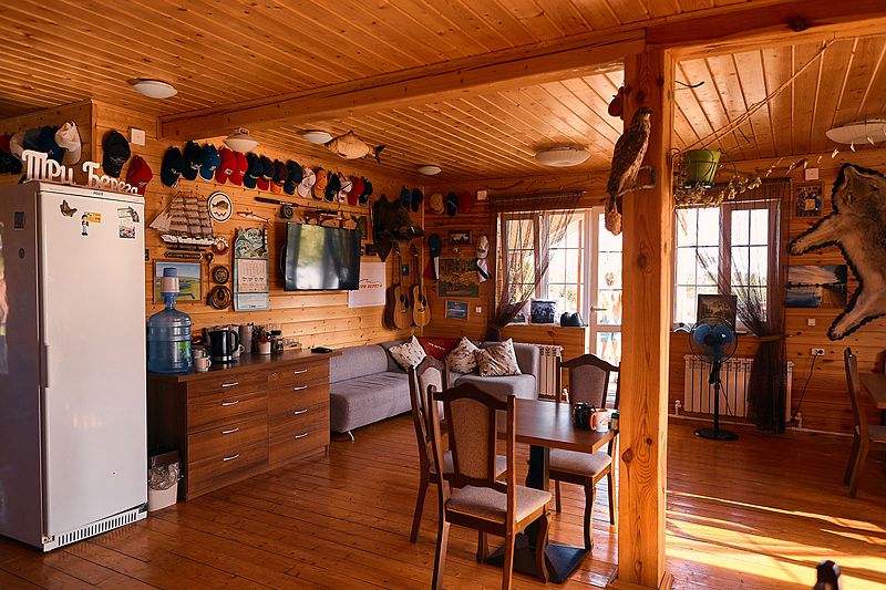 Главный общественный центр базы — гостиная, которая за годы работы превратилась в настоящий музей, хранящий историю и атмосферу этого места. Стены украшают фотографии гостей с трофеями, а полки заполнены сувенирами, привезенными из разных уголков страны.