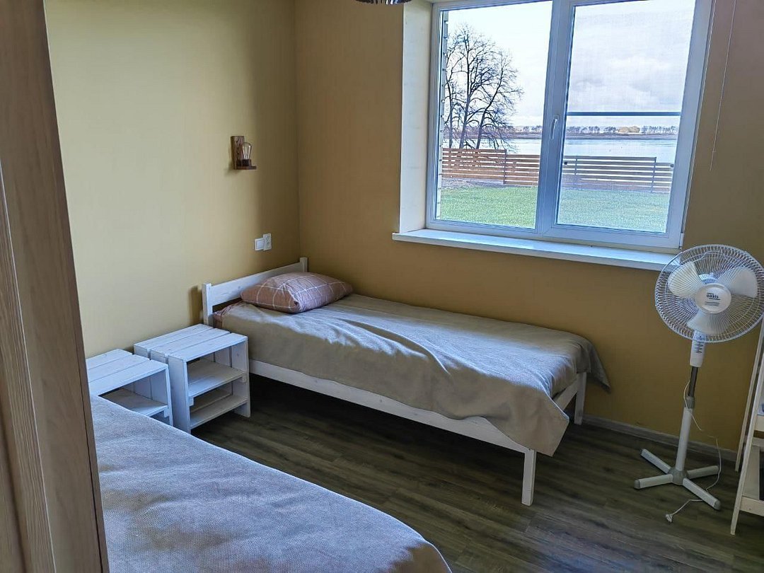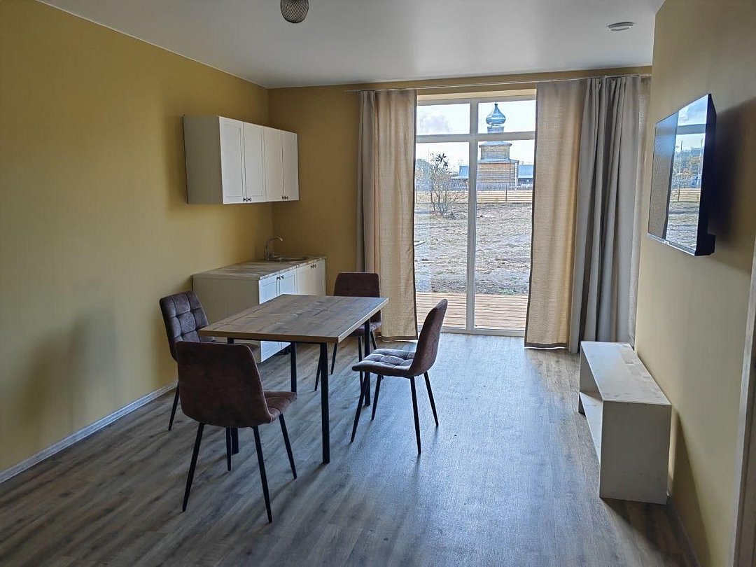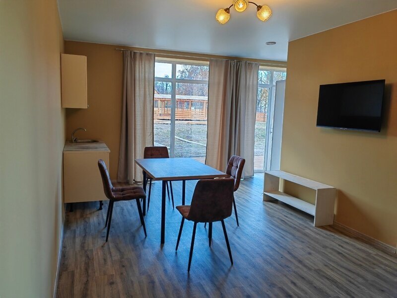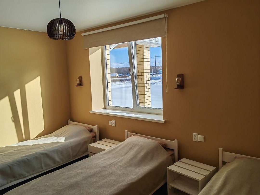 Гостиная с витражными окнами и выходом на террасу, кухня, холодильник, микроволновка, чайник, индукционная плитка, посуда. Две спальни, душ, туалет, ТВ, Wi-Fi.