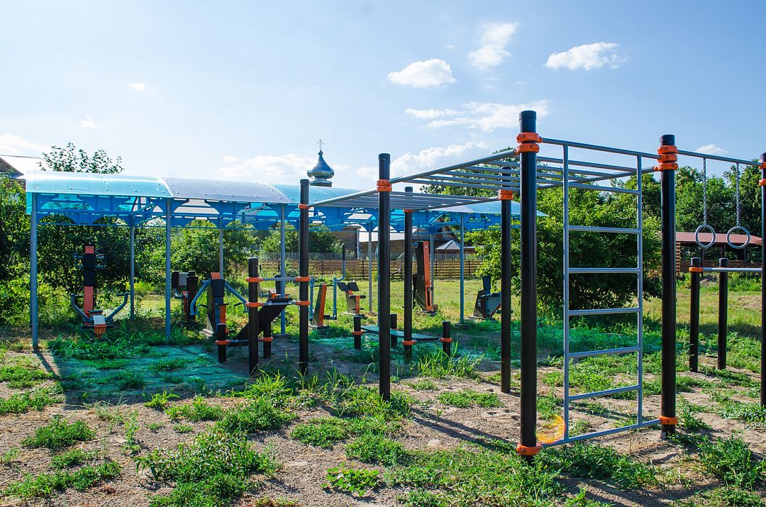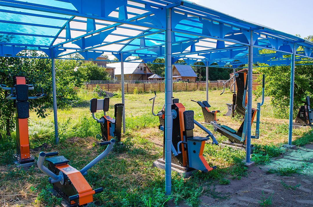 В тени навеса размещен тренажерный зал с девятью профессиональными уличными тренажерами, идеально подходящими для разнообразных тренировок.