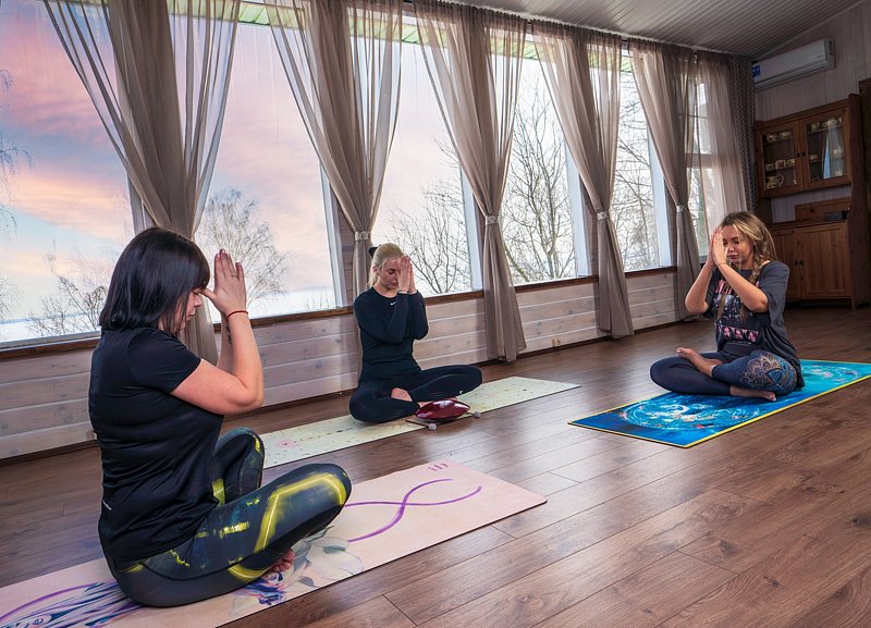 Занятия можно проводить в просторной гостиной (80 кв. м) с панорамным видом на Волгу или на зеленых газонах на территории комплекса.