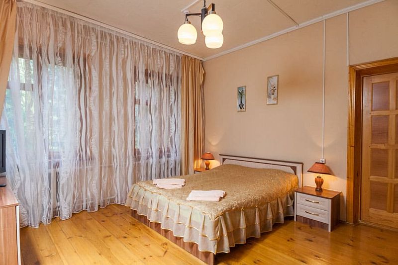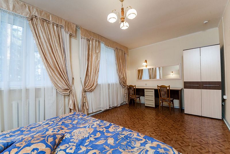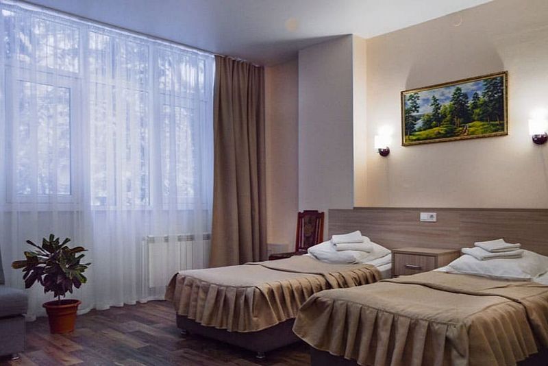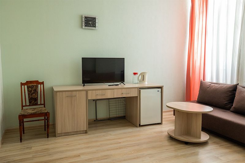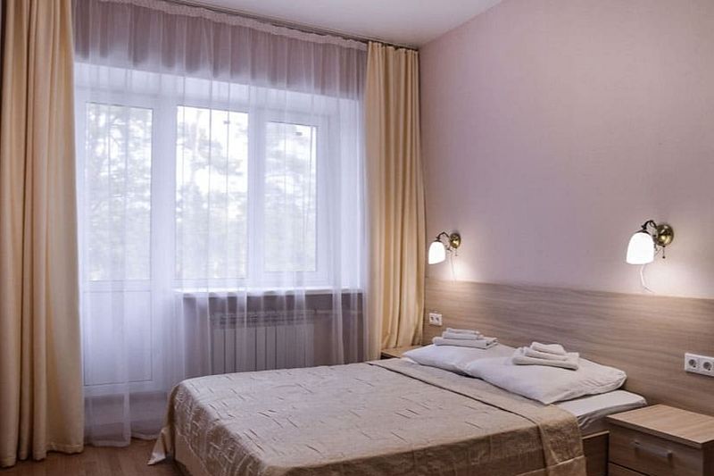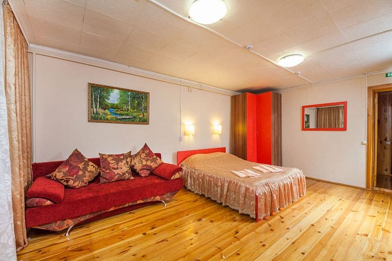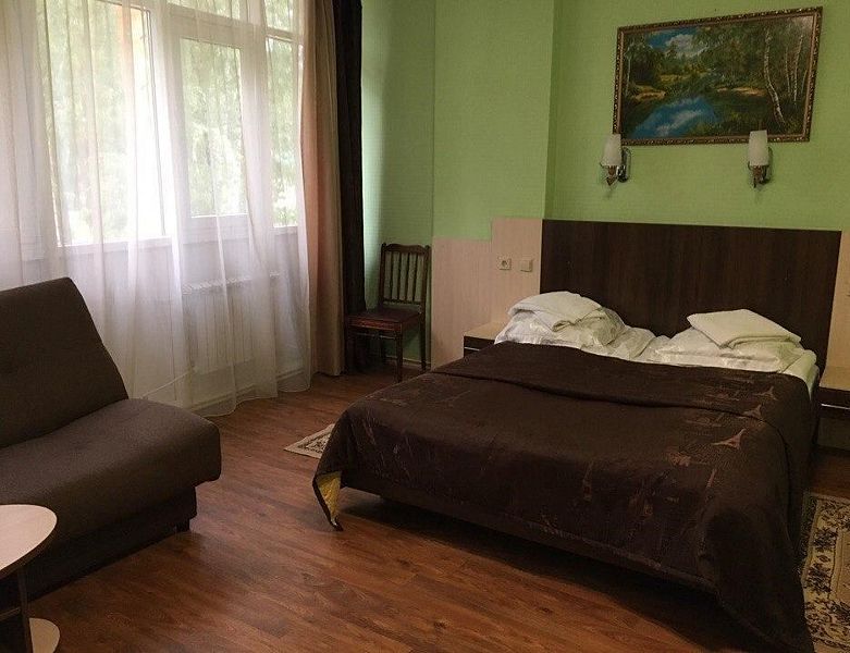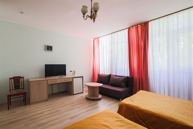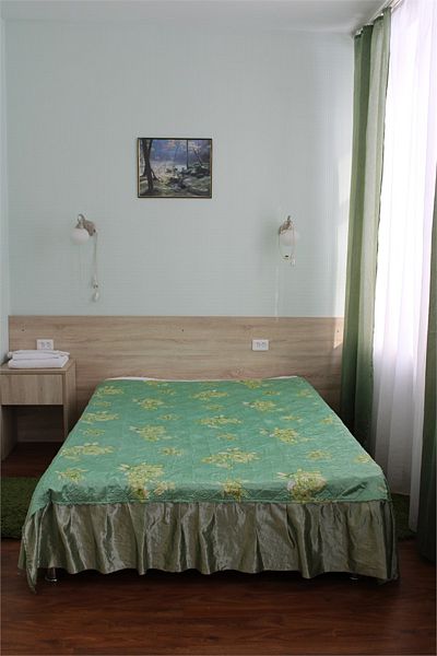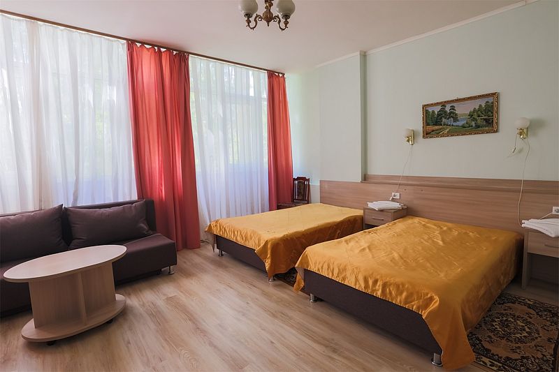 Комфортабельный однокомнатный номер. Расположение номера позволяет любоваться видами природы, открывающимися в разных направлениях. В номере, в одной комнате две раздельные кровати, шкаф, в другой комнате диван, телевизор, холодильник, сан-узел.
