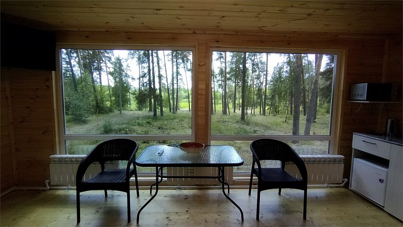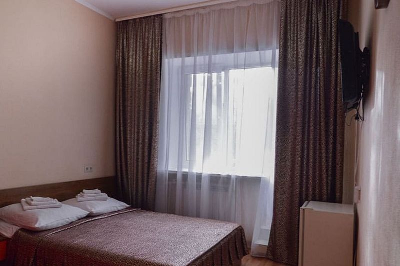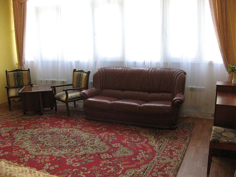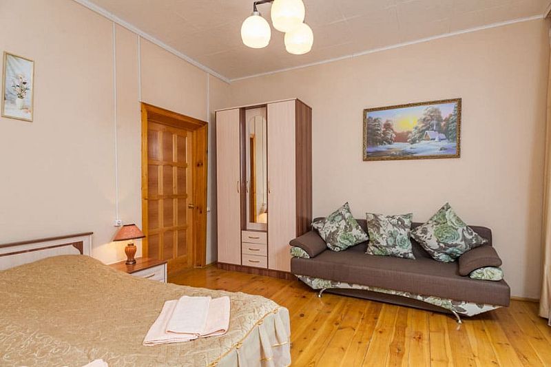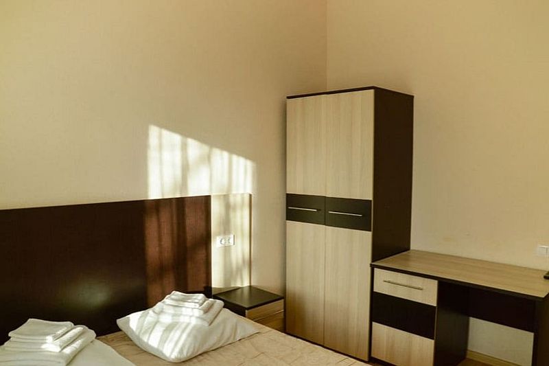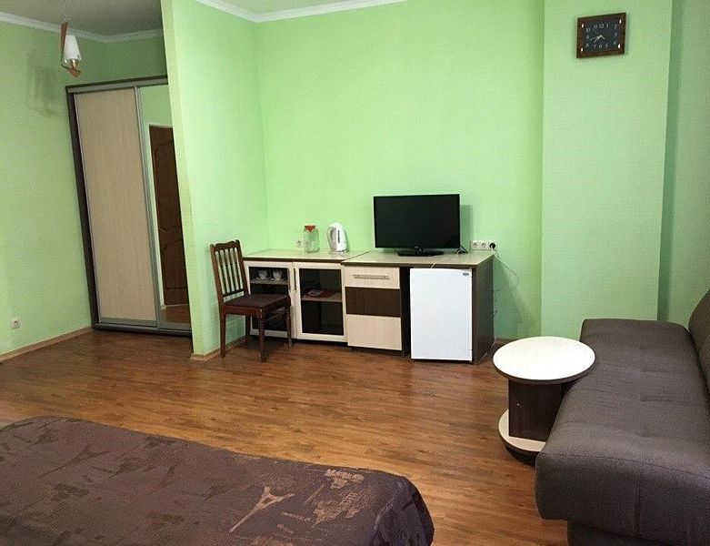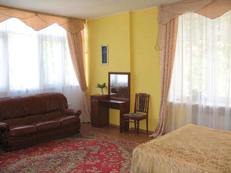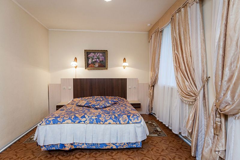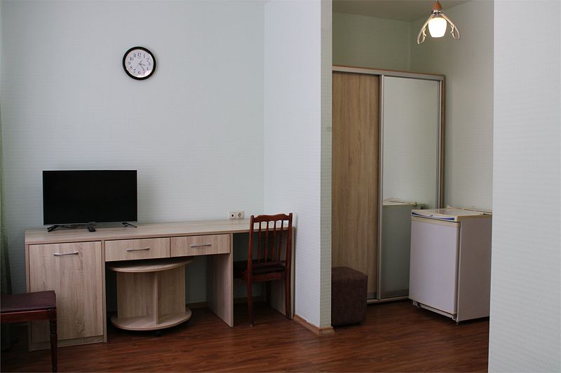 Комфортабельный однокомнатный номер. Расположение номера позволяет любоваться видами природы, открывающимися в разных направлениях. В номере, в одной комнате две раздельные кровати, шкаф, в другой комнате диван, телевизор, холодильник, сан-узел.