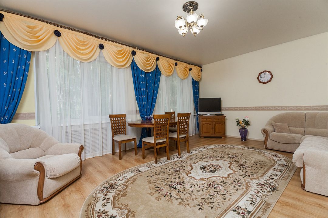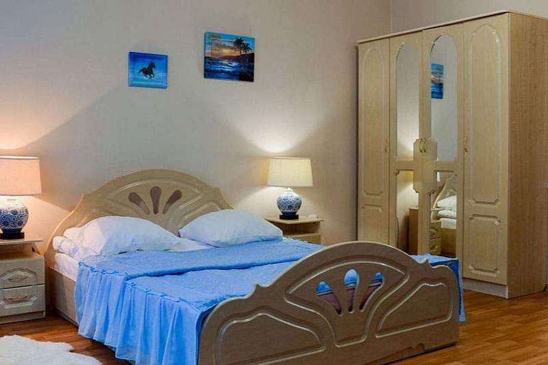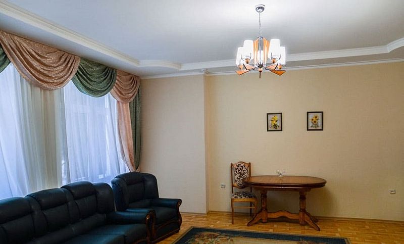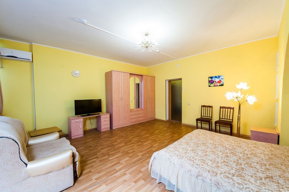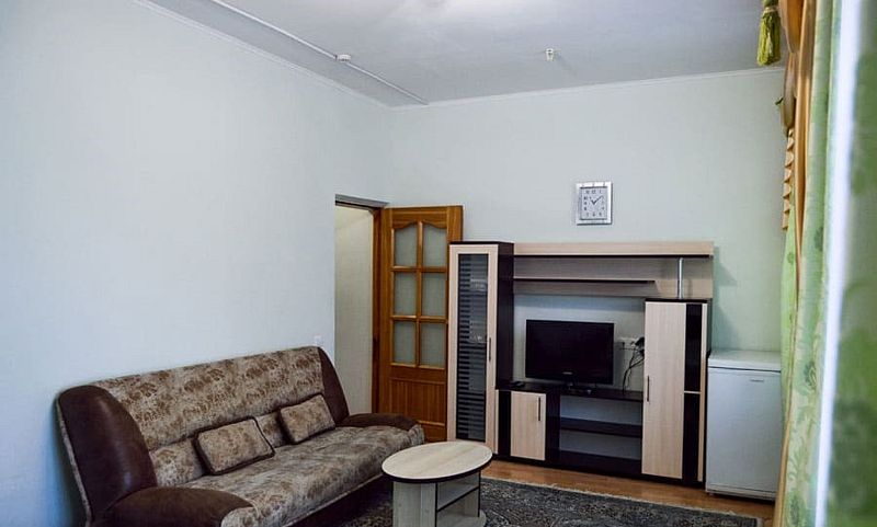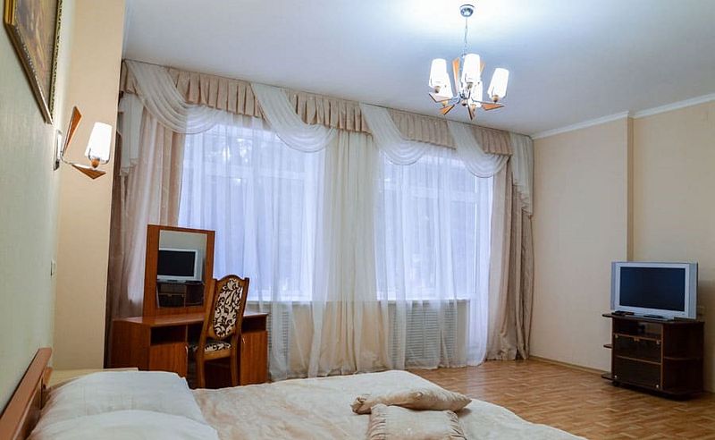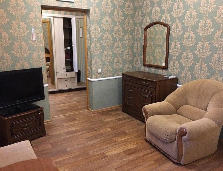 Комфортабельный двухкомнатный номер с телевизором, мягкой мебелью. В одной комнате двуспальная широкая кровать, в другой комнате диван, телевизор, холодильник, сан-узел.