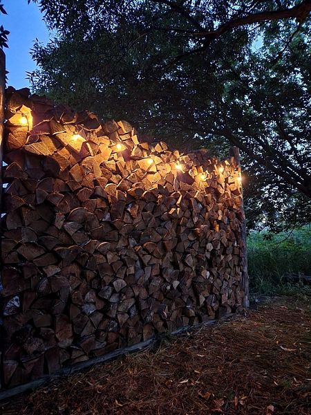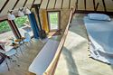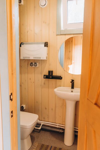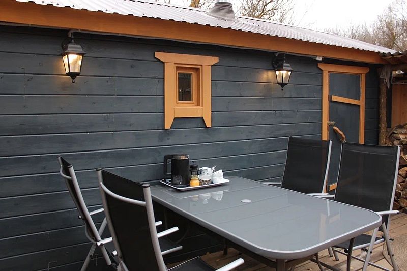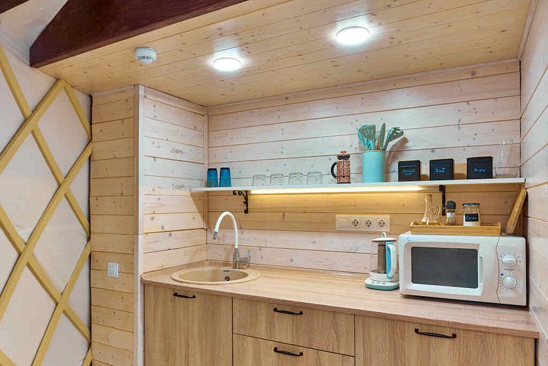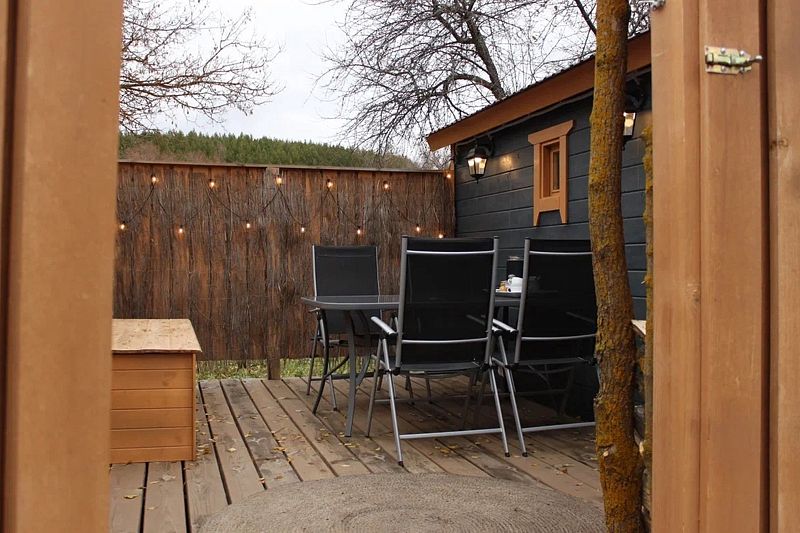 Внутри: двуспальная кровать, двуспальный матрас на мезонин этаже, кухня со всем необходимым, обеденный стол и стулья, ванная комната с душем и туалетом, печь-камин.