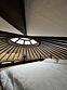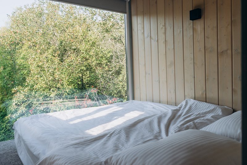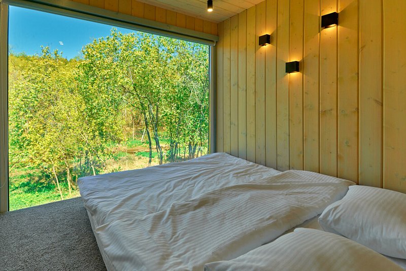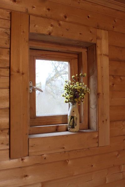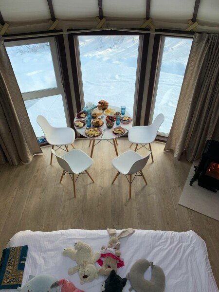 Внутри: двуспальная кровать, ванна на ножках перед панорамным окном, кухня со всем необходимым, обеденный стол и стулья, ванная комната с душем и туалетом, печь-камин.