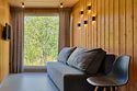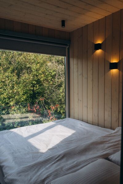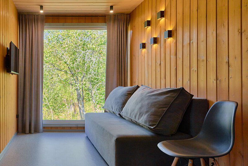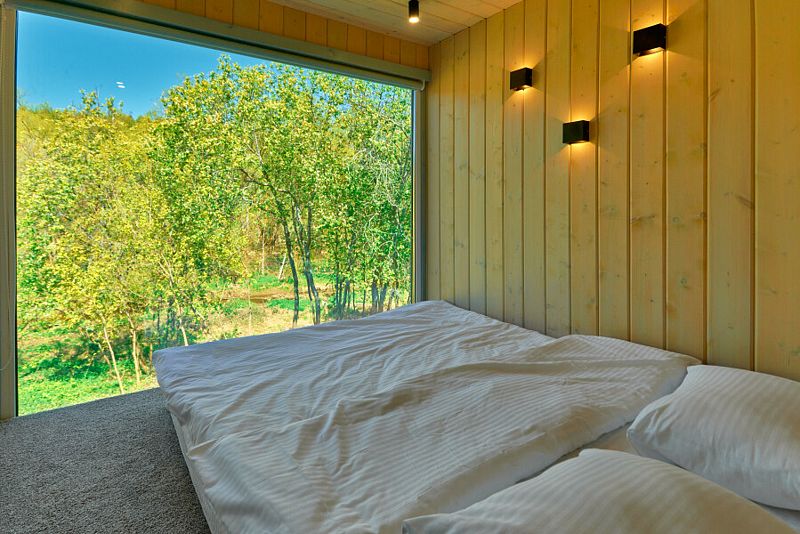 Внутри: отдельная спальня с панорамным окном на всю стену, раздвижной диван, кухня со всем необходимым, обеденный стол и стулья, ванная комната с душем и туалетом.