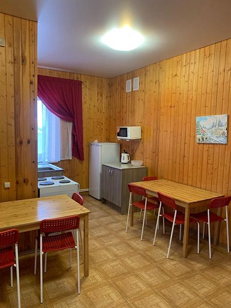 Четырёхместный номер с бильярдом, диваном, телевизором, столом и стульями, двуспальной кроватью, микроволновкой, холодильником, чайником, санузлом с душем