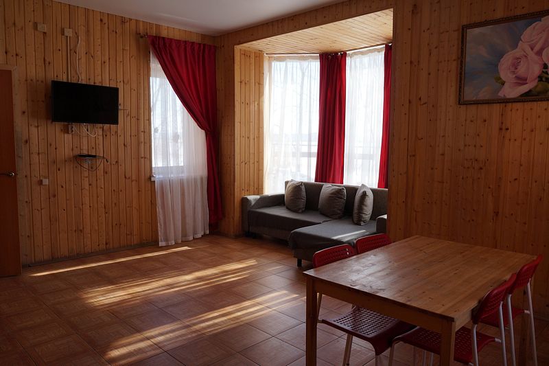 Площадь номера 40 кв.м. В номере: , гостиная, кухня,сауна, телевизор, посуда, микроволновая печь, электрочайник, кухонный гарнитур, холодильник, вода, мангал. В ванной: туалет, раковина, душевая кабина, зеркало, набор полотенец.