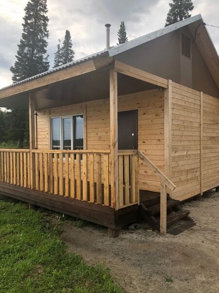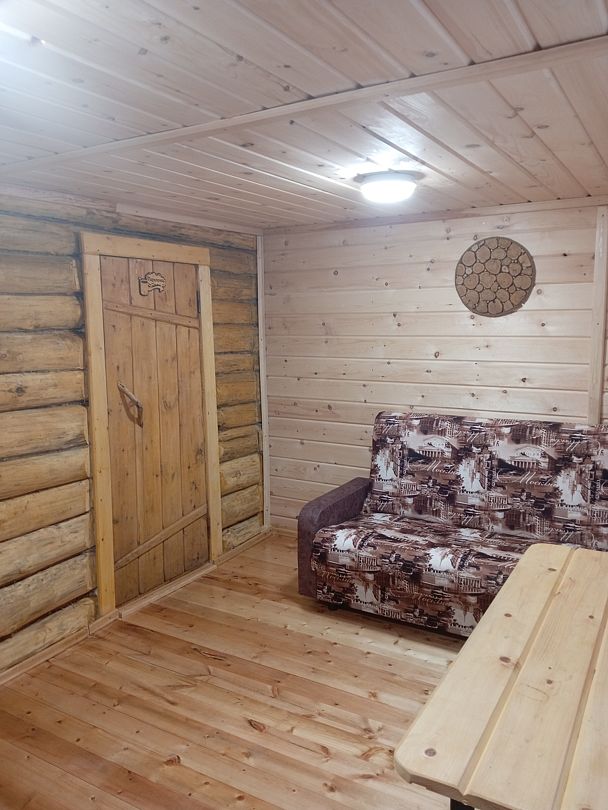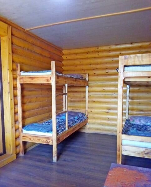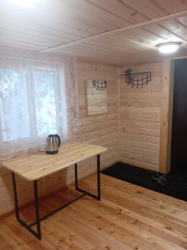 2 двухъярусные кровати или полати (на выбор), стол, телевизор, чайник, холодильник, большая веранда, зона для пикника с мангалом, WI-FI. Удобства на улице.