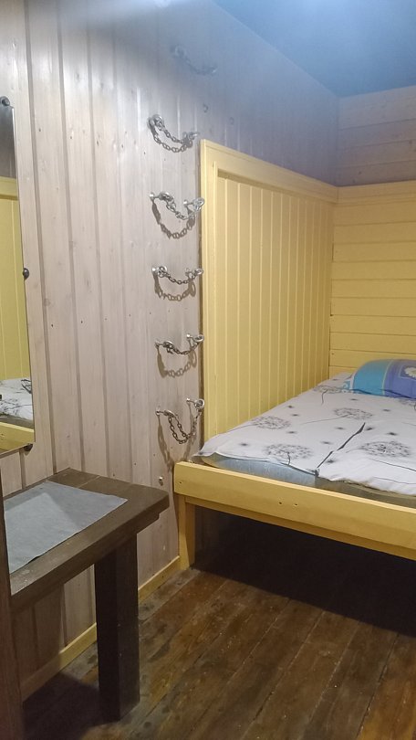 В номере есть две большие двух-спальные двух-ярусные кровати, столик для приема пищи, телевизор, холодильник и отдельный санузел с душевой. Отлично подойдет для семьи с детьми или веселой компании.