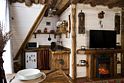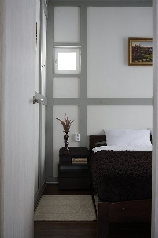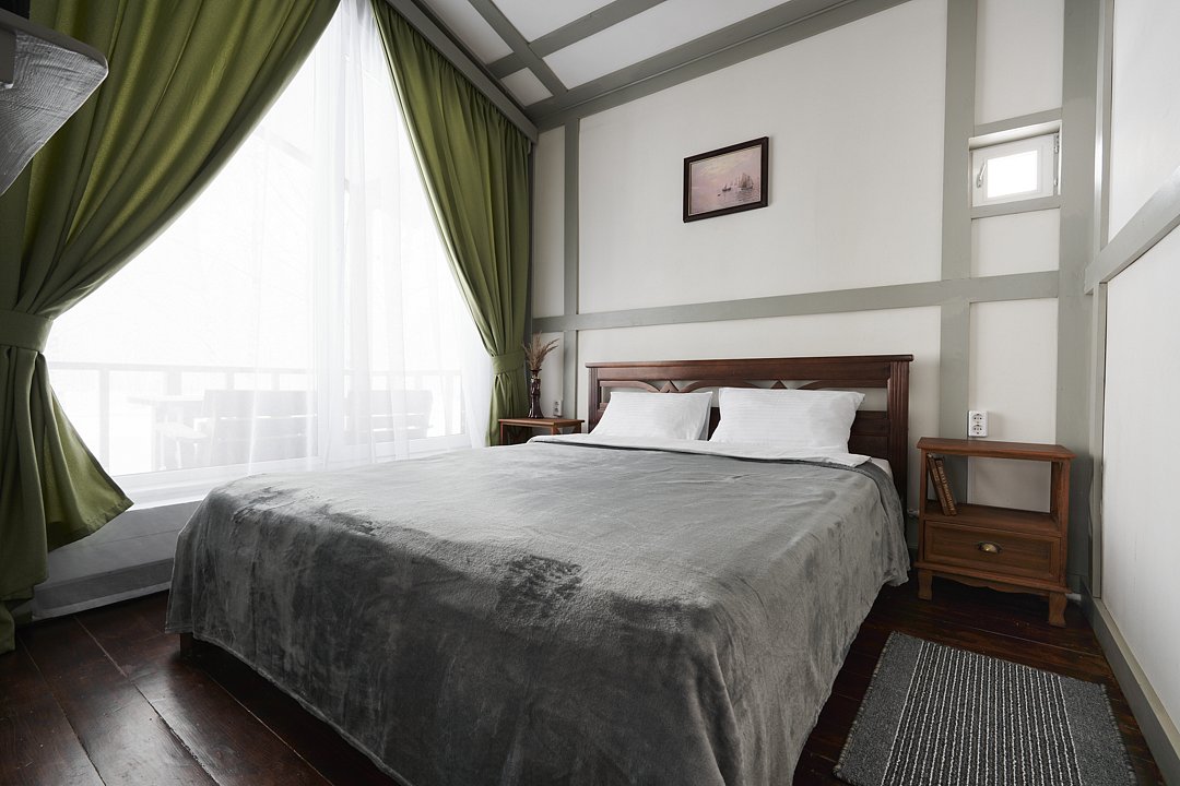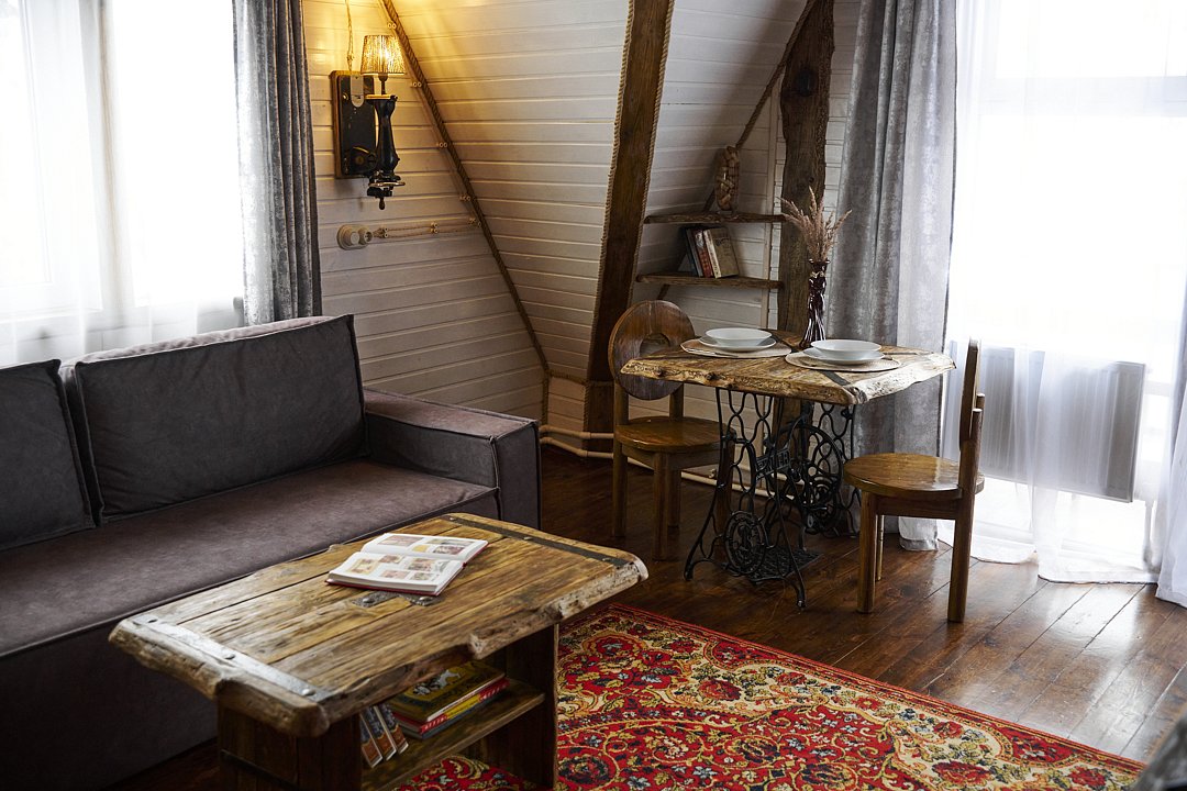 Окруженный березами, с большой своей территорией расположился домик в стиле фахверк на два номера. Этот двухместный номер – часть дома. У номера своя терраса, мангальная площадка. Внутри традиционная обстановка.