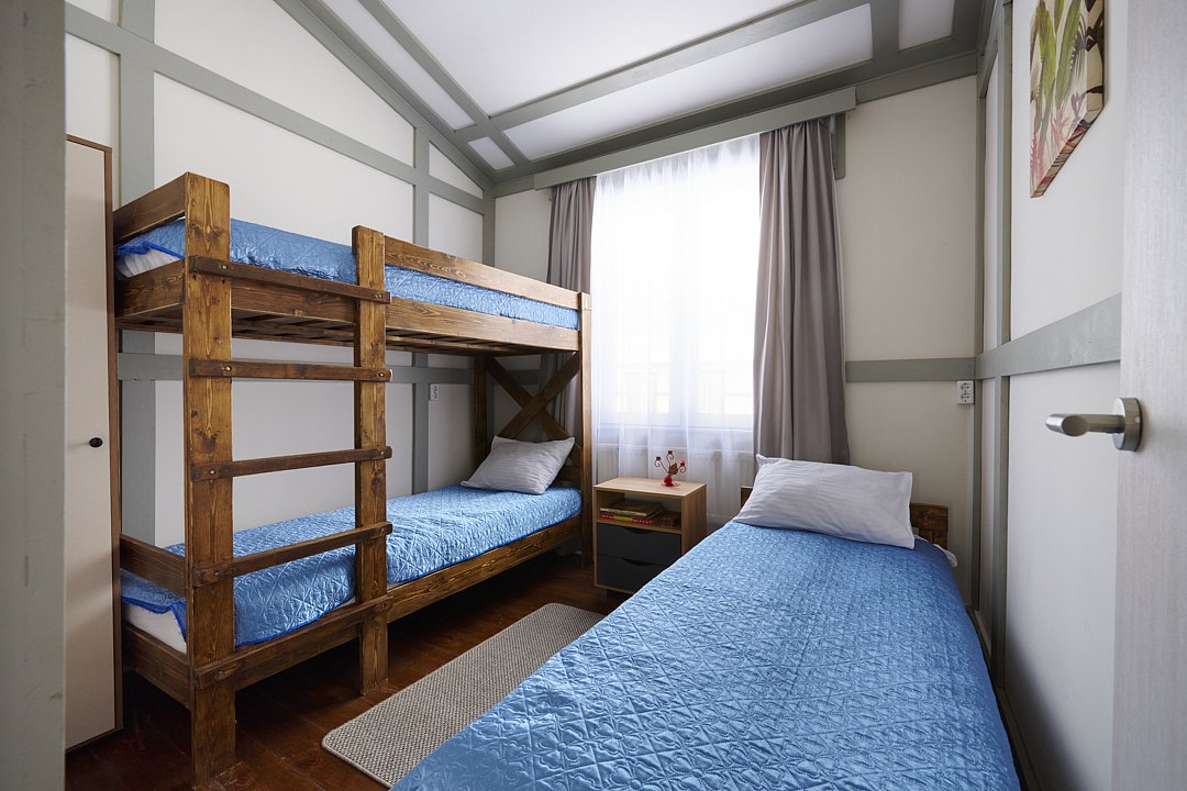 Три односпальные кровати, одна двуспальная кроватьВ коттедже