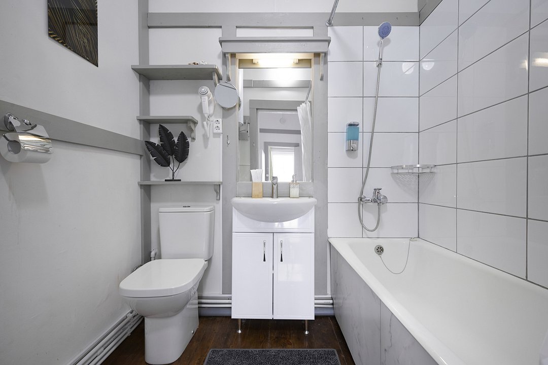 В санузле – ванна, умывальник, унитаз, фен, зубной набор, полотенца. В дозаторе в ванне – «гель/шампунь в одном» хорошего качества.