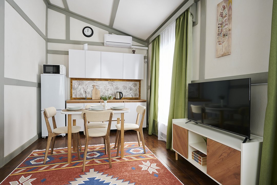 У номера своя терраса, мангальная площадка. Внутри традиционная обстановка — двуспальная кровать, телевизор, столик. Также в доме есть мини-кухня со всем необходимым.