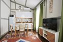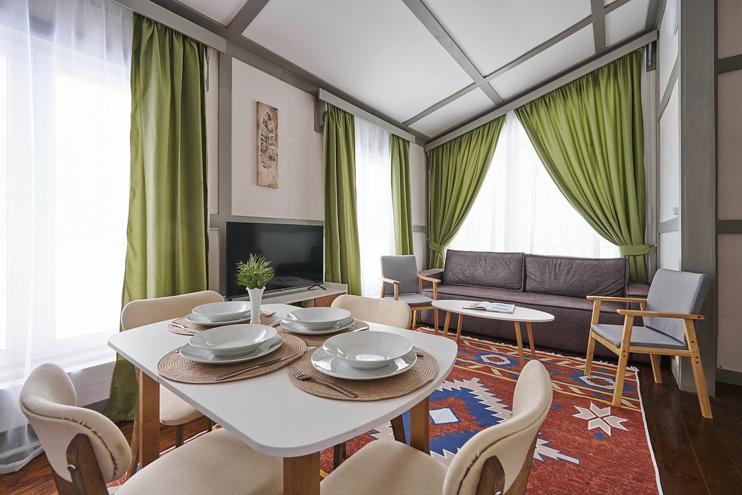 Комфортный дом с двумя санузлами, электрокамином. В гостиной — диван (здесь можно организовать два дополнительных места), кресло-качалка, телевизор, обеденная зона.