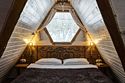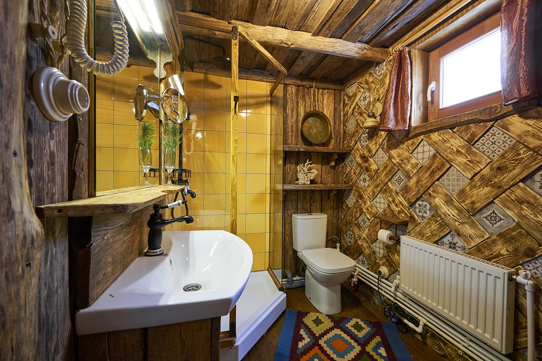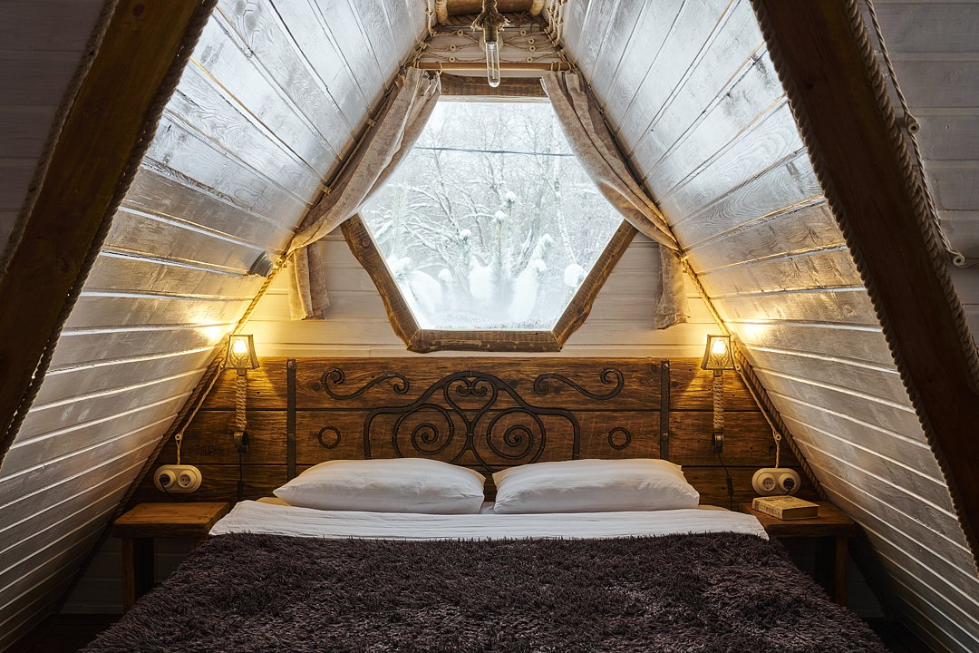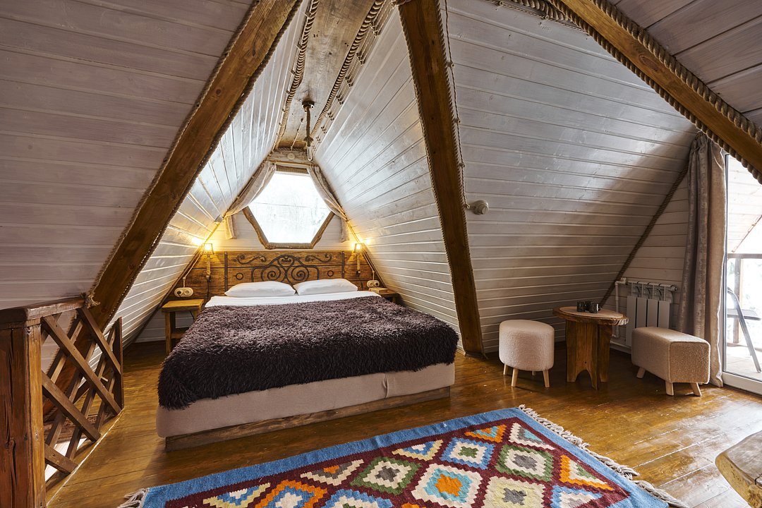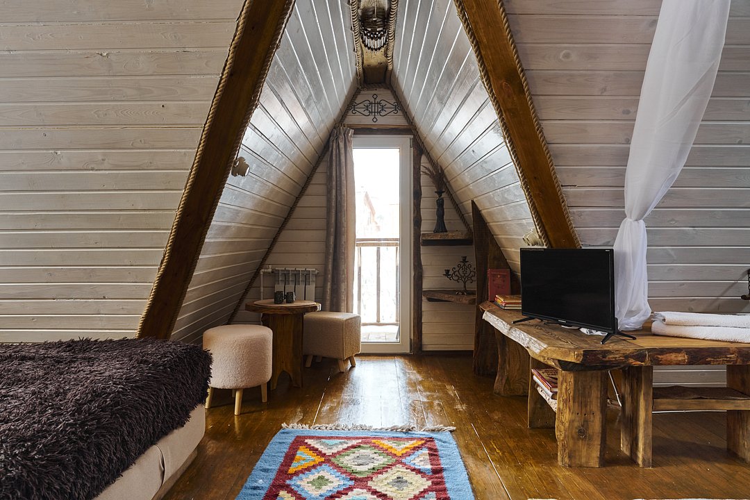 В спальне на втором этаже двуспальная кровать, телевизор, собственный санузел. Из спальни можно пройти на балкончик, где стоят стол и кресла.