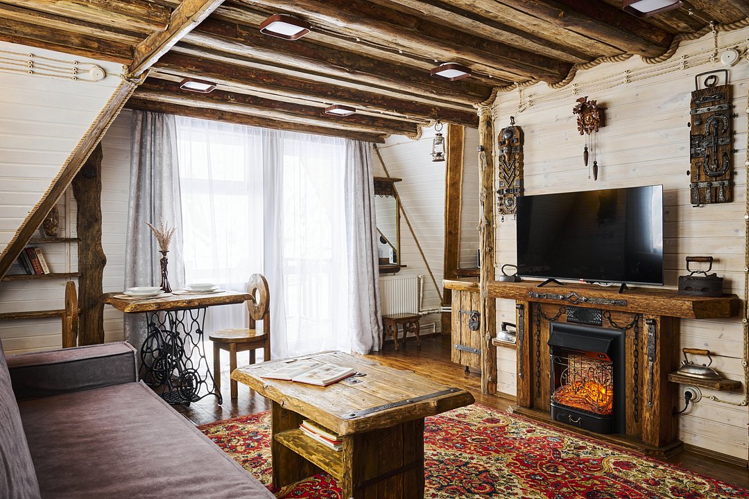 На первом этаже — гостиная с диваном и электрокамином, обеденный стол, кресло-качалка, мини-кухня. Элементы интерьера сделаны вручную.