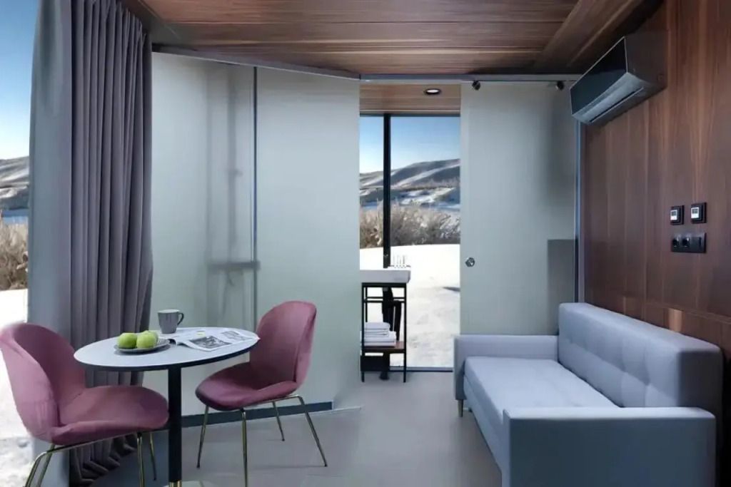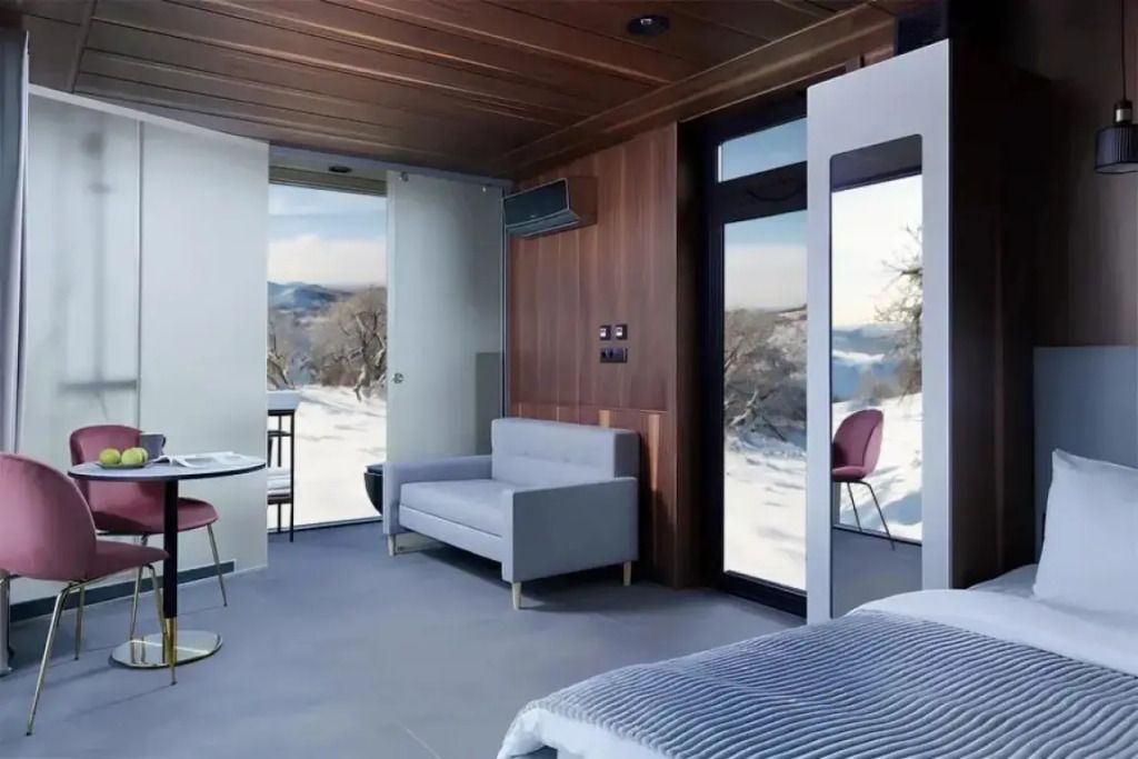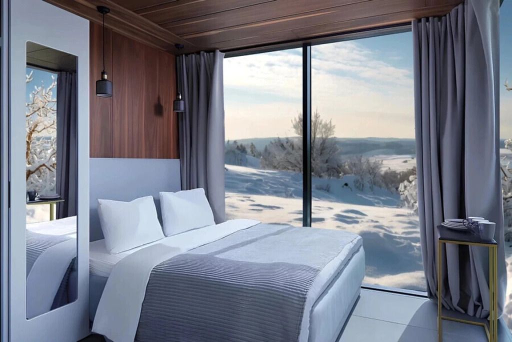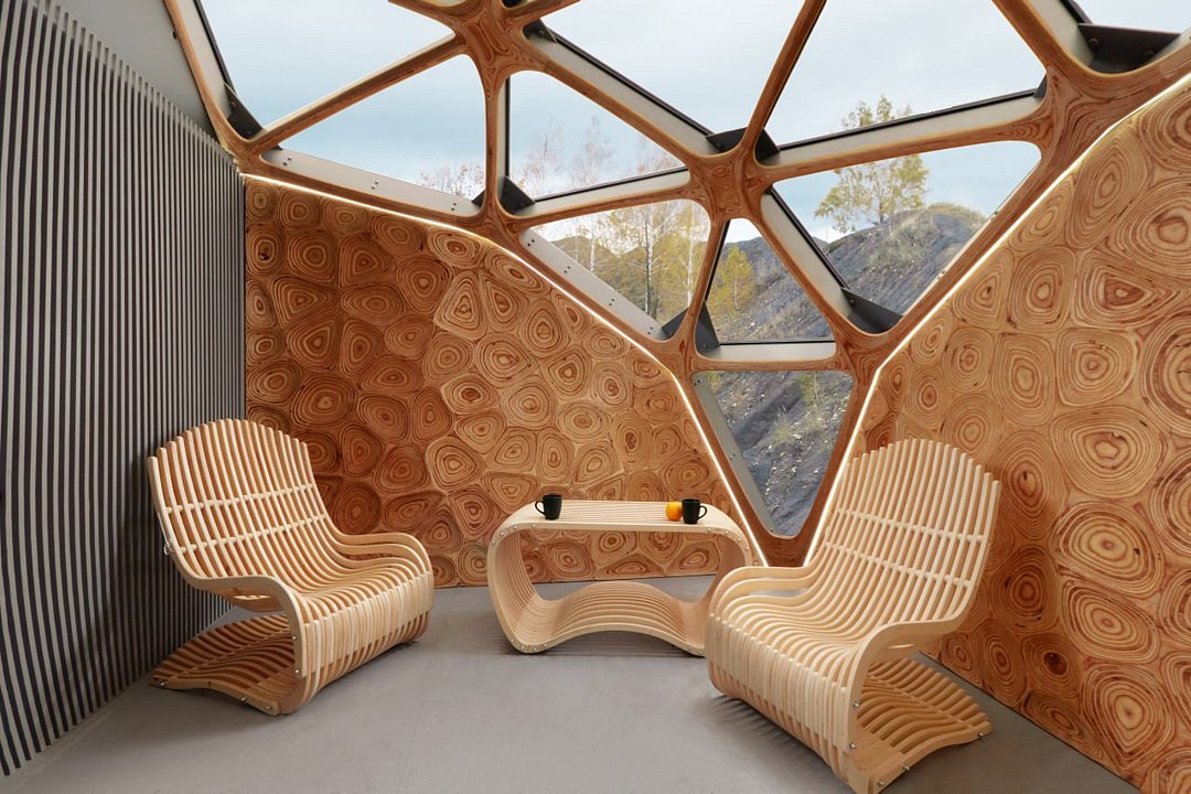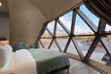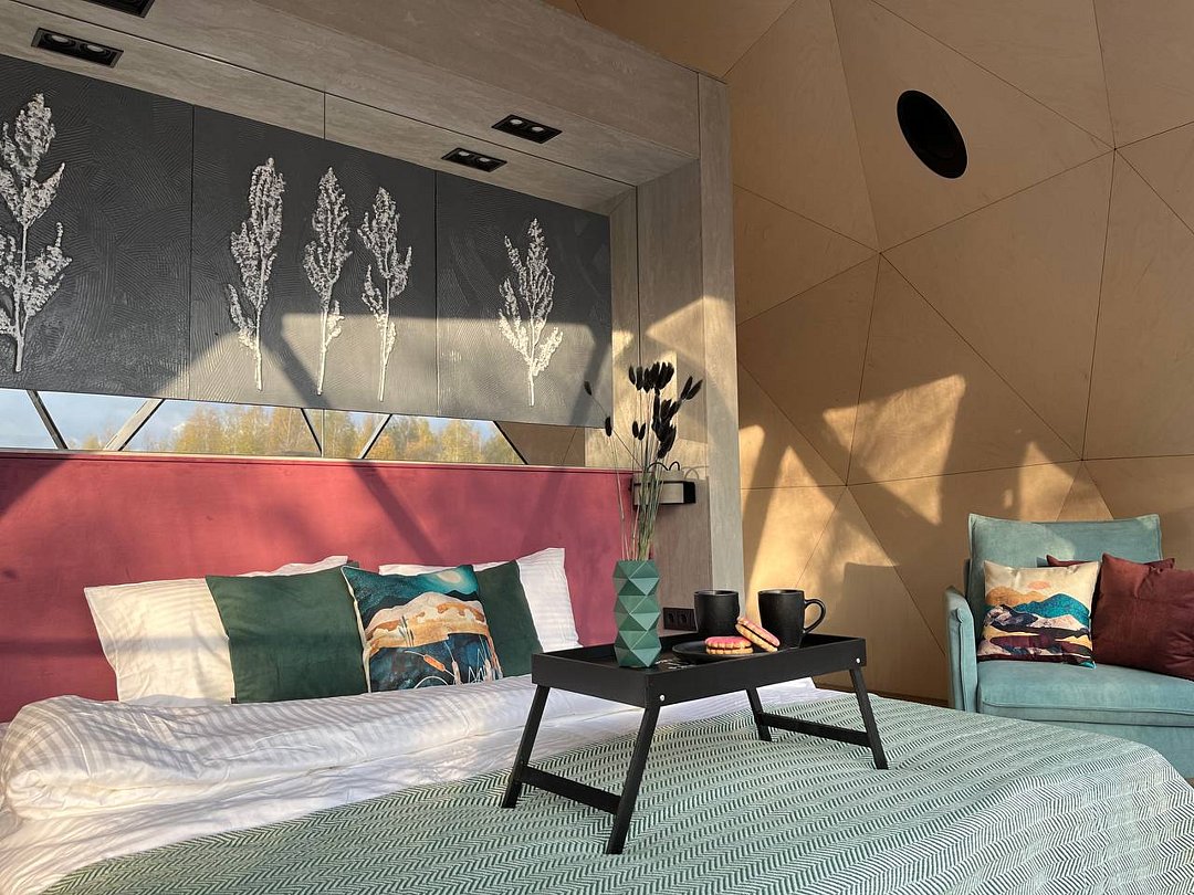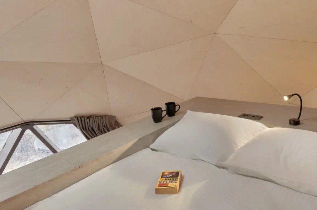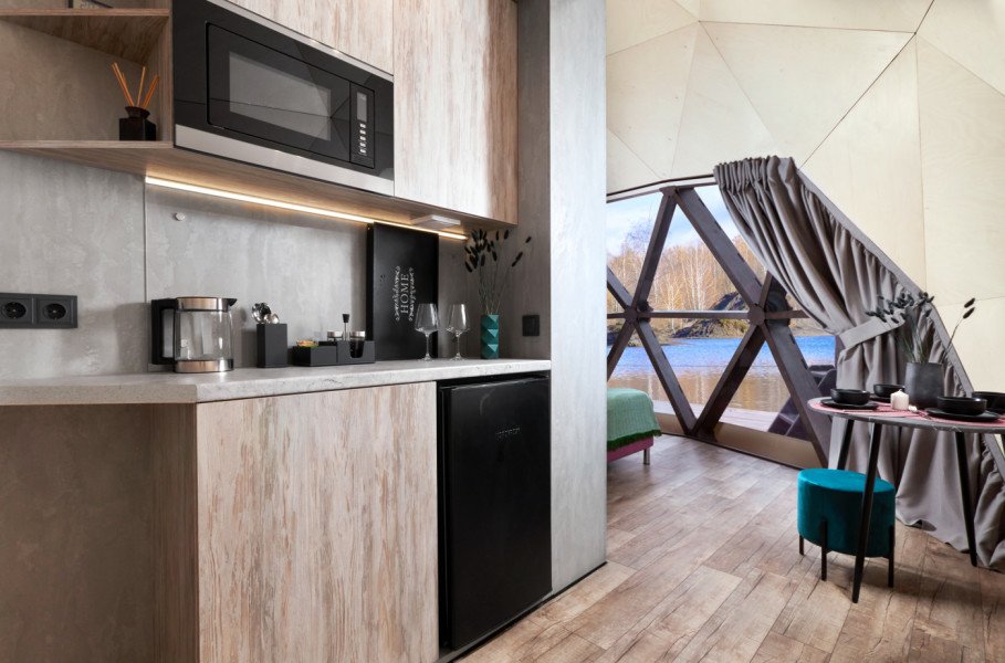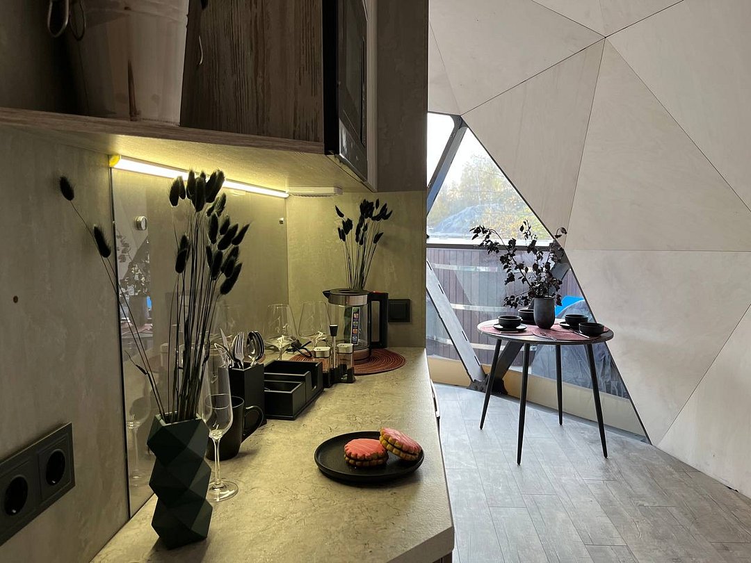 Каждый геокупол для проживания выполнен в современном дизайне с тщательной заботой о каждой детали. В каждом номере имеется удобная мебель, санузел, индивидуальная терраса с термальной купелью, панорамное окно и завораживающие пейзажи необычной природы, окружающей нас. Также имеется электрический чайник, мини-холодильник и чайная посуда.