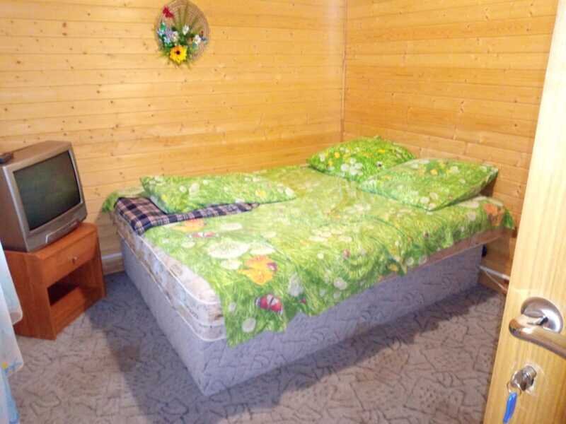 Внутри спальные места (кровати с сенными матрасами, постельные принадлежности), стол, телевизор, освещение, розетка. Туалет и душ расположены рядом с домиками.