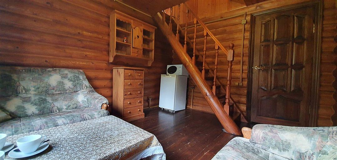 Двуспальная кровать на втором этаже и диван на 2 спальных места; на первом этаже угловой диван (трансформируется на два спальных места), шкаф, стол, комод, стулья, вешалка, зеркало.