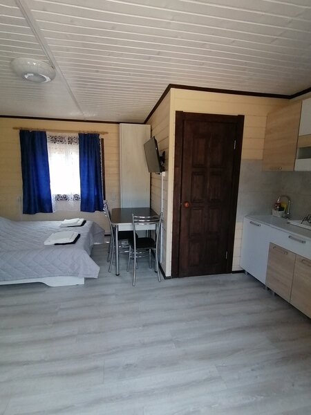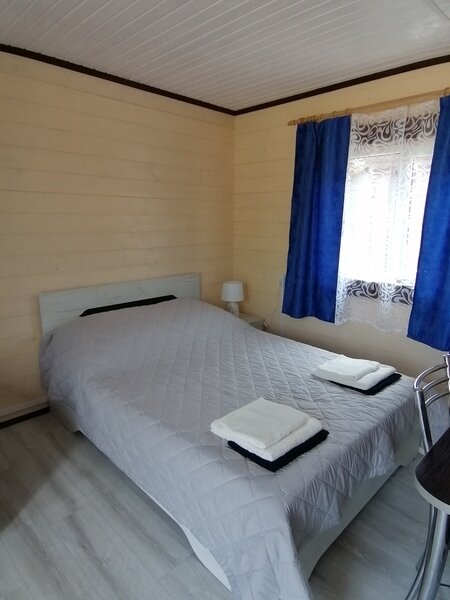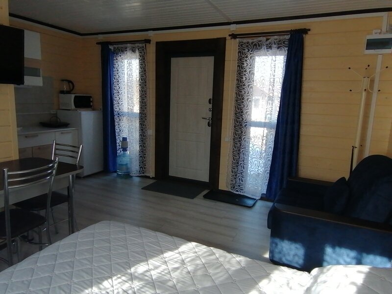 Дом №3. Идеально подойдет молодой паре для спокойного и уютного отдыха. Коттедж рассчитан от 1 до 3 человек. В доме один этаж, расположена комфортная двухспальная кровать и раскладной диван. Установлен кондиционер, ещё один плюс для комфортного проживания. Мини-кухня со всем необходимым, санузел и душ. Рядом детская и спортивная площадки. В пешей доступности река Ока с песчаным пляжем.