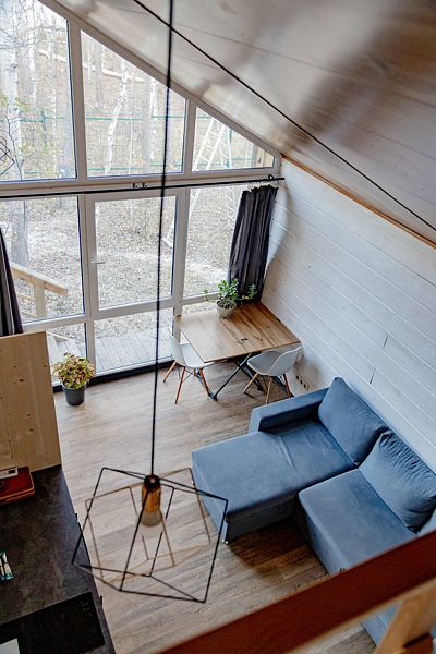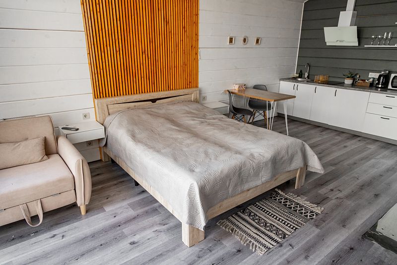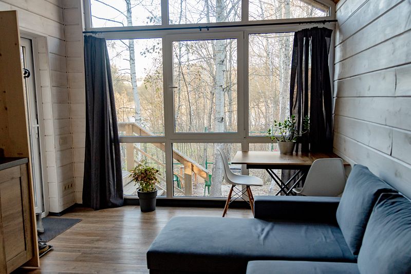 Уютный домик, со своей крытой террасой, современной русской баней, панорамными окнами смотрящими в глубь смешанного леса. Многофункциональная кухня со всеми необходимыми принадлежностями, собственный мангал, приборы для гриля. У домика 4 спальных места. Прекрасное место для отдыха семей с детьми, дружных компаний, и тихих посиделок.