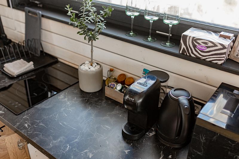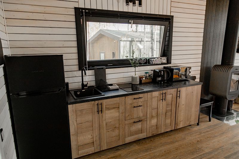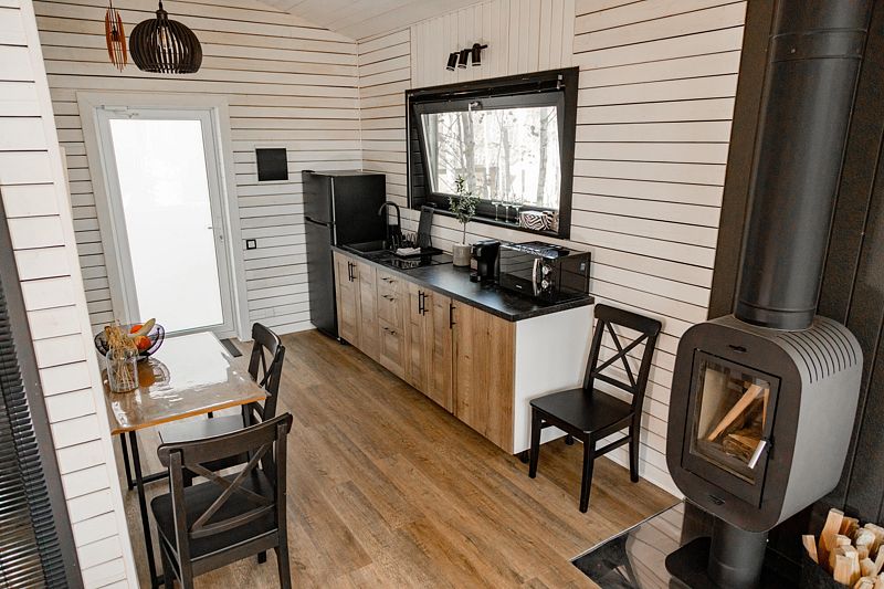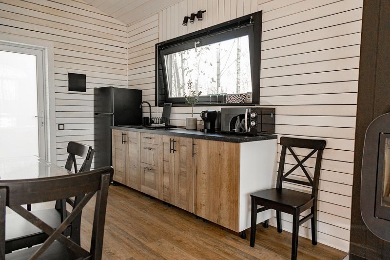 Дом оборудован полноценной кухней со всем необходимым, обеденной зоной, ванной комнатой с теплыми полами, гигиеническими наборами, феном, тапочками. В комплектацию коттеджа входит чайная станция.