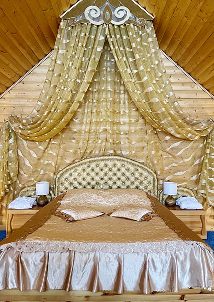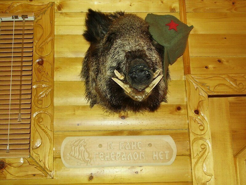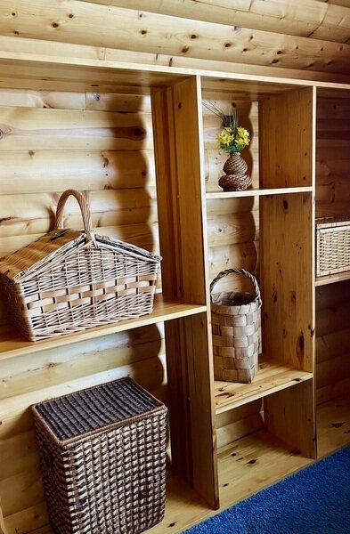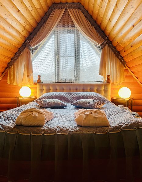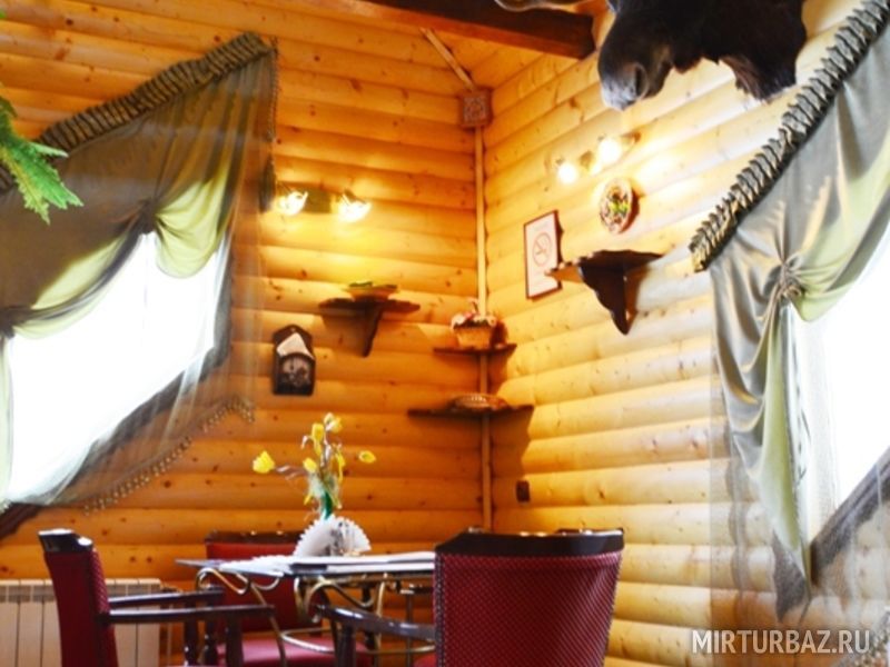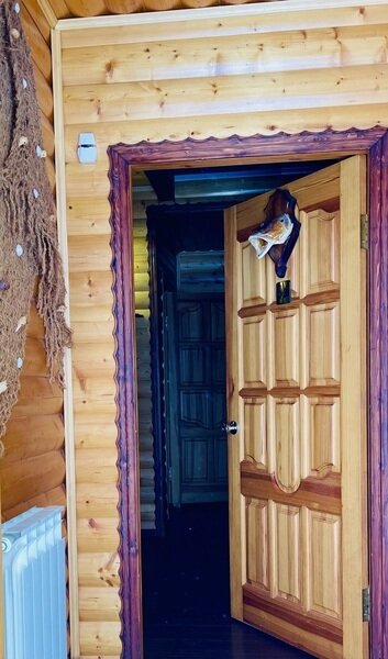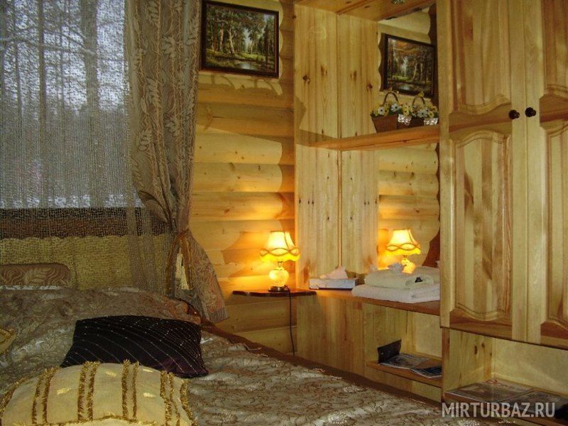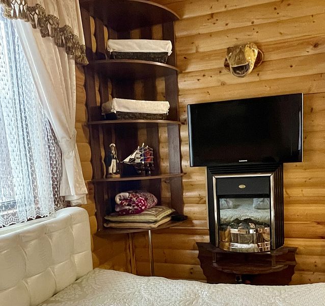 Две комфортабельные двуспальные кровати позволят Вам разместиться со всеми удобствами и обеспечат спокойных и глубокий сон. Оформление домика полностью соответствует тематике – развешенные на стенах шкуры диких животных, а также голова лося – прямое тому доказательство.