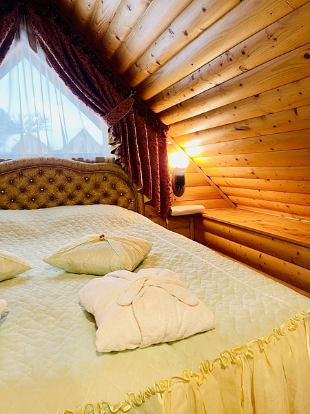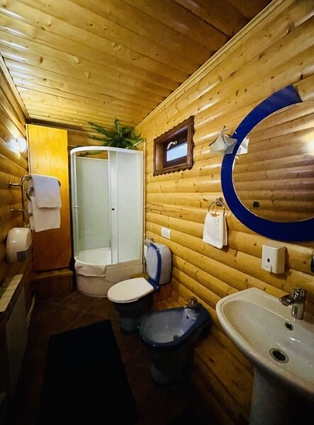 Туалетная зона находится в самом коттедже. Система теплого пола не даст Вам замерзнуть. Душевая кабина и биде сделают Ваш отдых еще более комфортабельным. Кроме того, мы предоставляем все необходимые туалетные принадлежности, в число которых входят тапочки, халаты и предметы личной гигиены.
