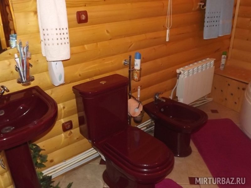 Туалетная комната в коттедже оборудована всем необходимым – туалет, душевая кабина и биде. В этой части дома обустроены теплые полы, так что можно стоять на полу босиком без боязни простудиться. Вам предоставят все туалетные принадлежности – халаты, полотенца, тапочки, предметы личной гигиены.
