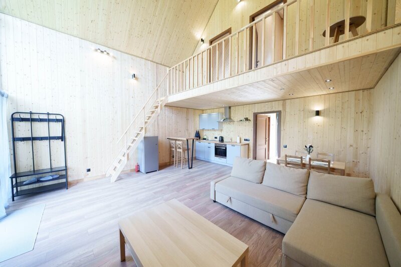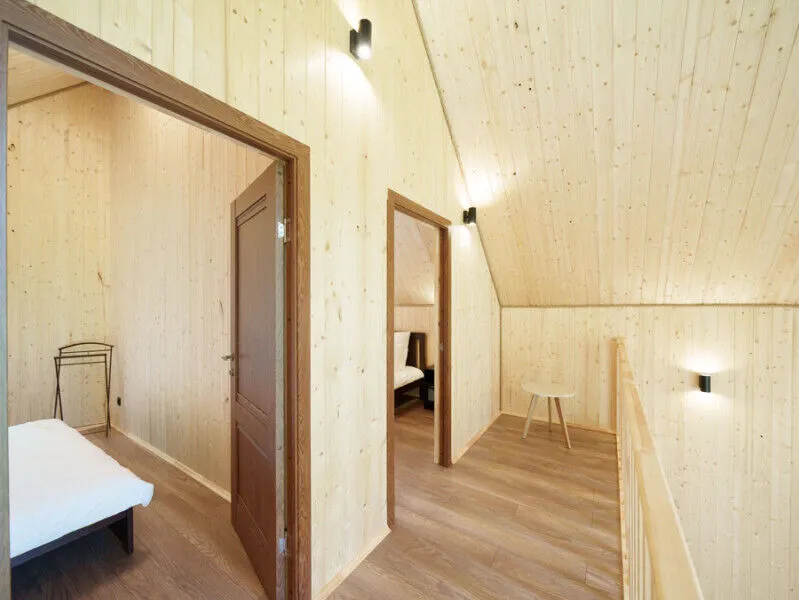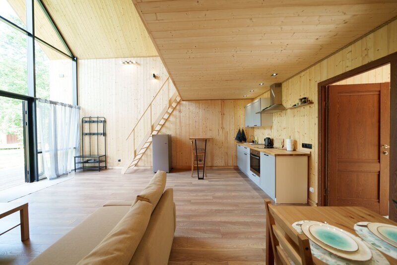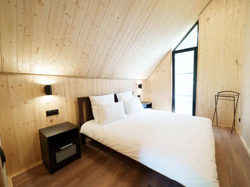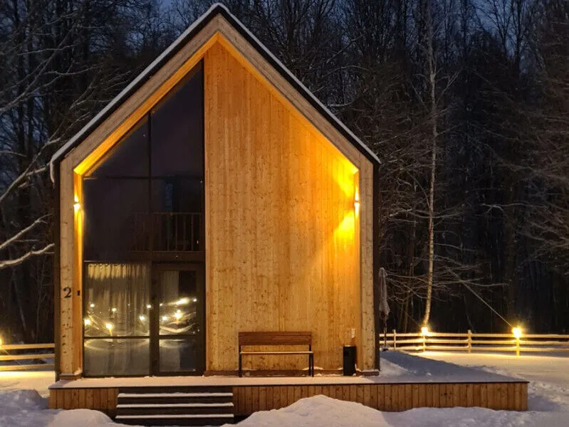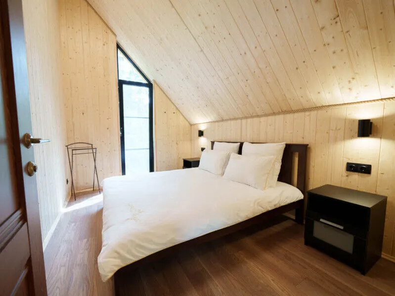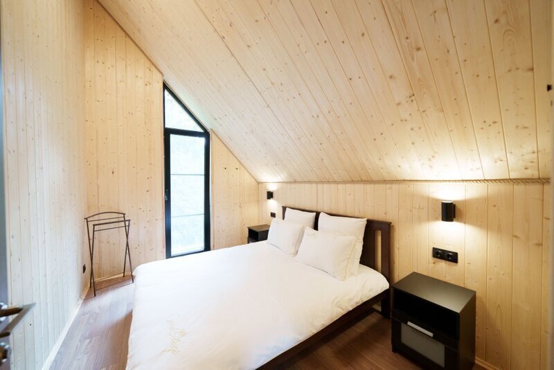 Внутри каждого домика вы найдете все необходимое для комфортного отдыха двоих, семьи или компании друзей. Уютные спальни с панорамными окнами, выходящими на окружающий лес, оборудованы качественными матрасами и постельным бельем высокого стандарта.